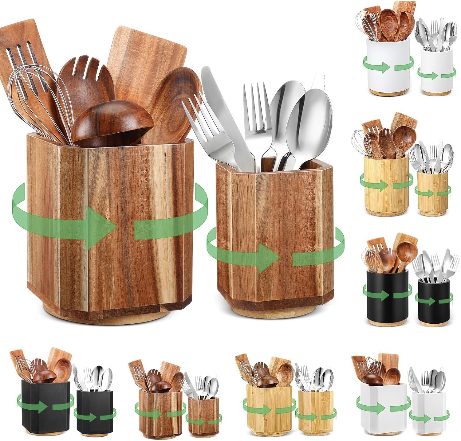 2 Pack Wooden Utensil Holder, 360°Rotating Kitchen Cooking Utensil Crock, Spoon Spatula Holder for Kitchen Counter, Farmhouse Countertop Organizer(Acacia,Square)