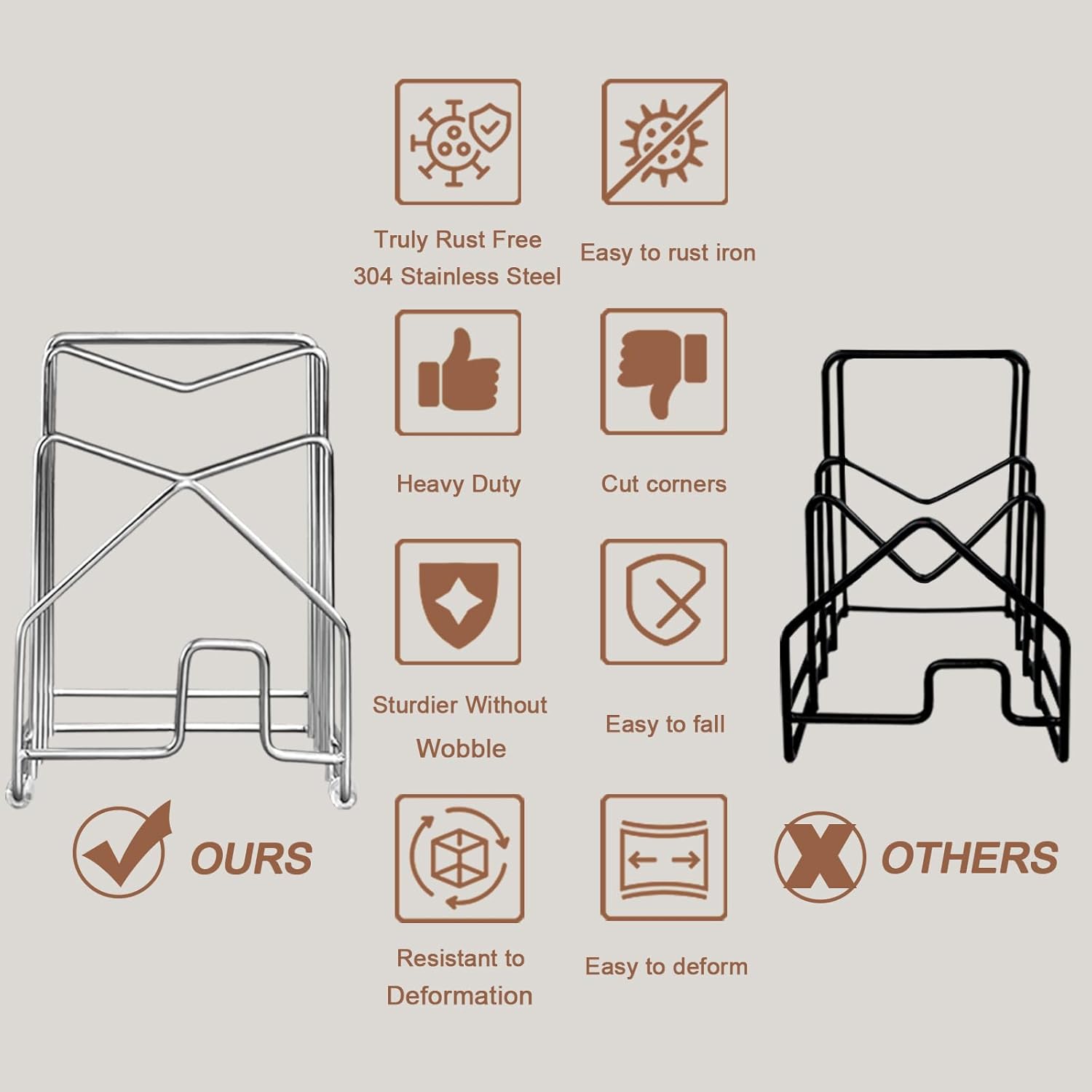 - BUILT TO LAST CUTTING BOARD RACK: made of always rust free 304 stainless steel to withstand daily use while lasting for years. The round edge design helps protect against scratches, and the anti-skid pads keeps everything firmly in place
