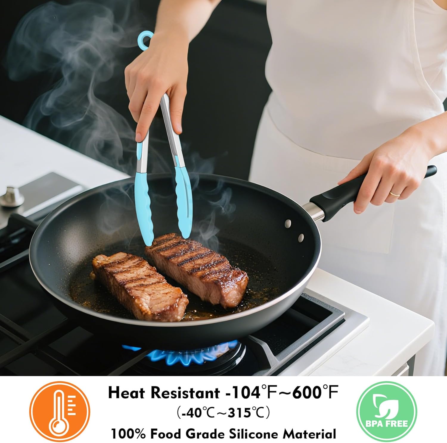 - HEAT RESISTANT ERGONOMIC HANDLES: The cooking tongs' handle is cushioned with silicon, good for thumb rest and ensures good grip and control. The Food Grade silicon tongs tip is heat resistance 600°F and less prone to scratch the pan. Easy to rinse, dishwasher safe.