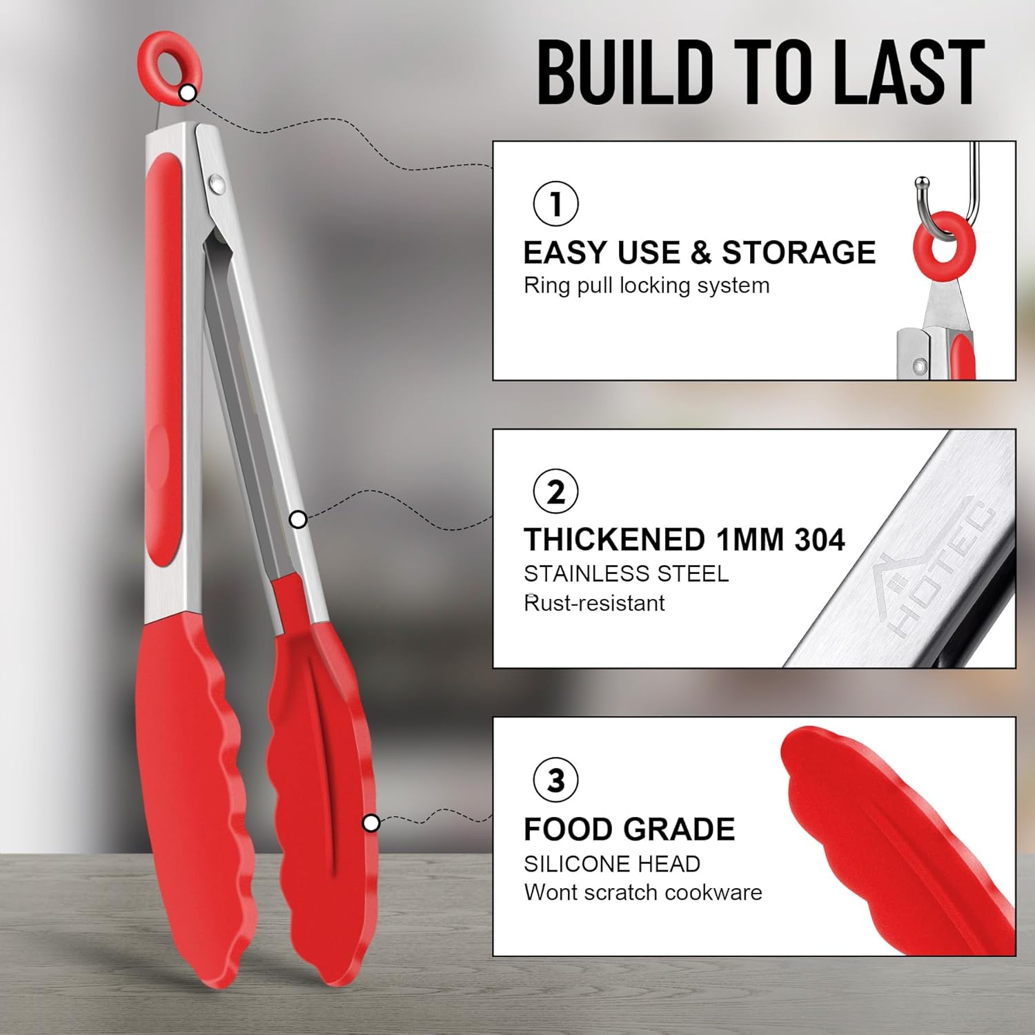 - ENGINEERING FOR SAFETY: Hotec Kitchen Tongs, Updated new design pattern for the handle, better protects your hands from cutting by the edge when you grip the handle. Easy to control the handle and to eliminate wobbling & any risk of burning your hands.