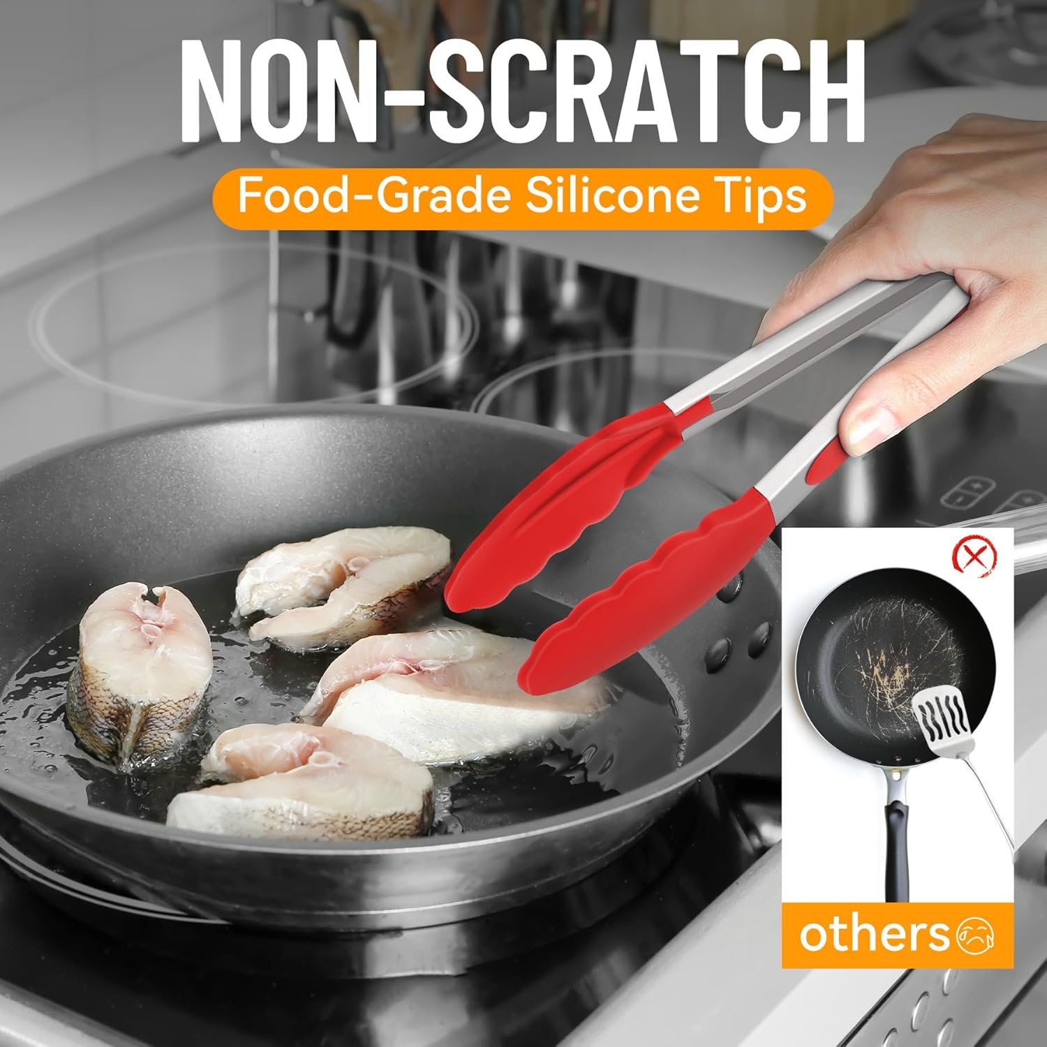 - HEAT RESISTANT ERGONOMIC HANDLES: The cooking tongs' handle is cushioned with silicon, good for thumb rest and ensures good grip and control. The Food Grade silicon tongs tip is heat resistance 600°F and less prone to scratch the pan. Easy to rinse, dishwasher safe.