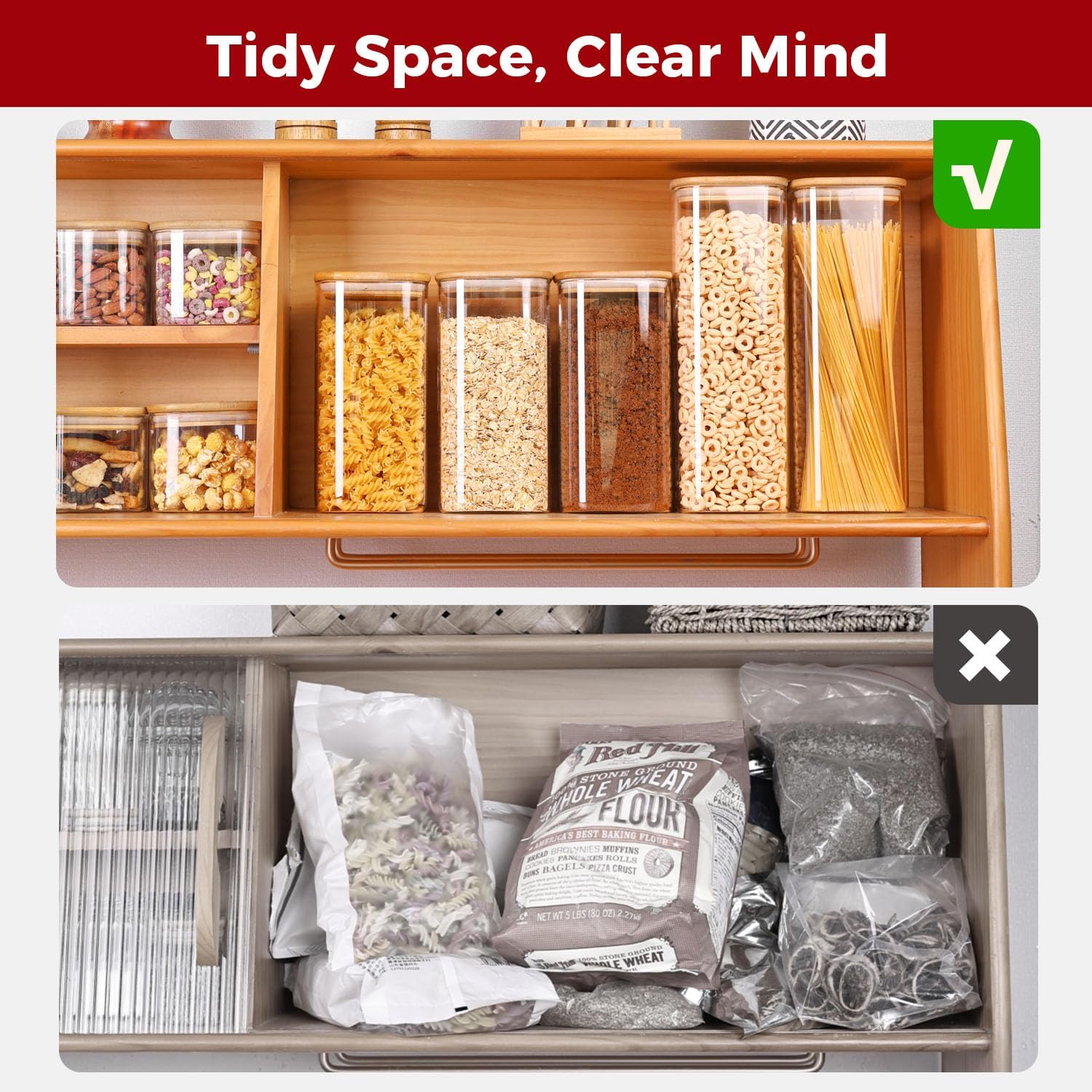 - 【Clear Glass, Easy Visibility】Made from crystal-clear glass, these square canisters let you see contents at a glance. A sleek and practical solution to keep your countertop, shelf, or cabinet neat and stocked.