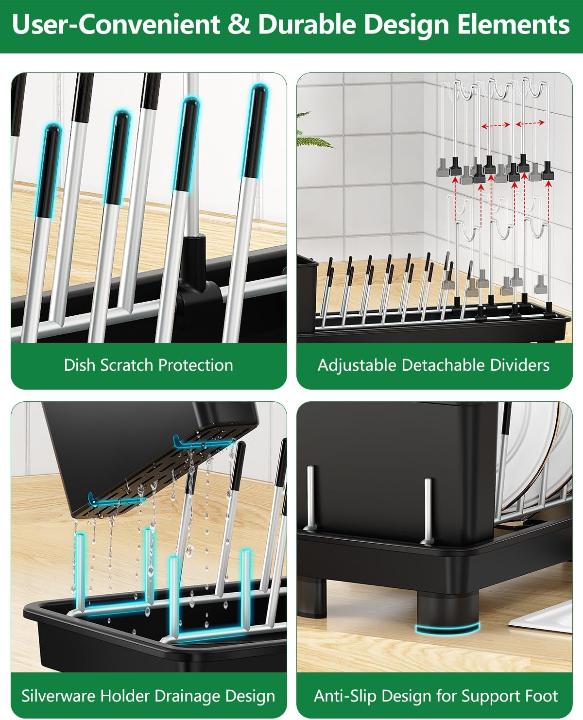 - [Rust Resistant & Sturdy]: Constructed with corrosion-resistant stainless steel, the CosyPic countertop drying rack features a reinforced frame and a sleek black finish. It includes a utensil caddy with an integrated drainage design, made from BPA-free plastic. The base features four non-slip rubber feet for stability on countertops. Crucially, each stainless steel grate that contacts plates is wrapped in food-grade black silicone. This silicone coating prevents scratches on your dinnerware and enhances durability.