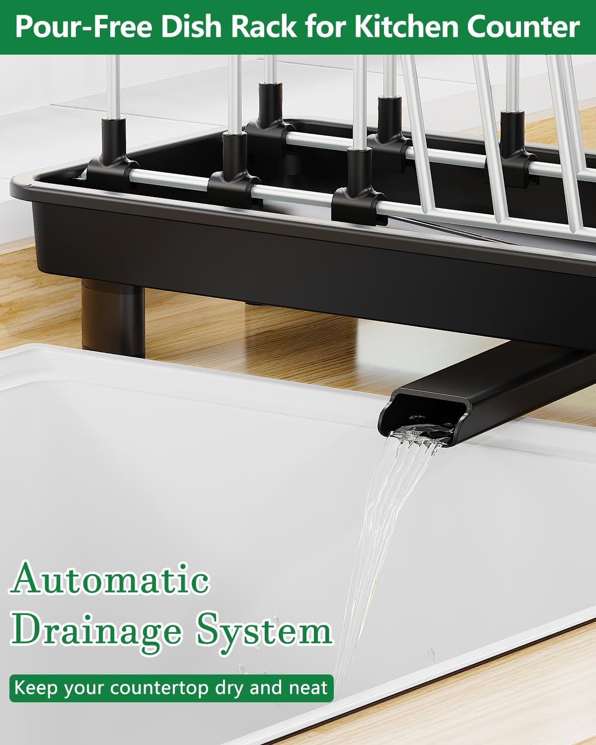 - [Automatic drainage system]: CosyPic compact dish rack features a central drain hole and two adjustable drain spouts. The entire rack can be placed on either the left or right side of your sink countertop, thanks to these adjustable spouts. This ensures water flows directly into the sink without splashing onto the countertop or pooling in the base.