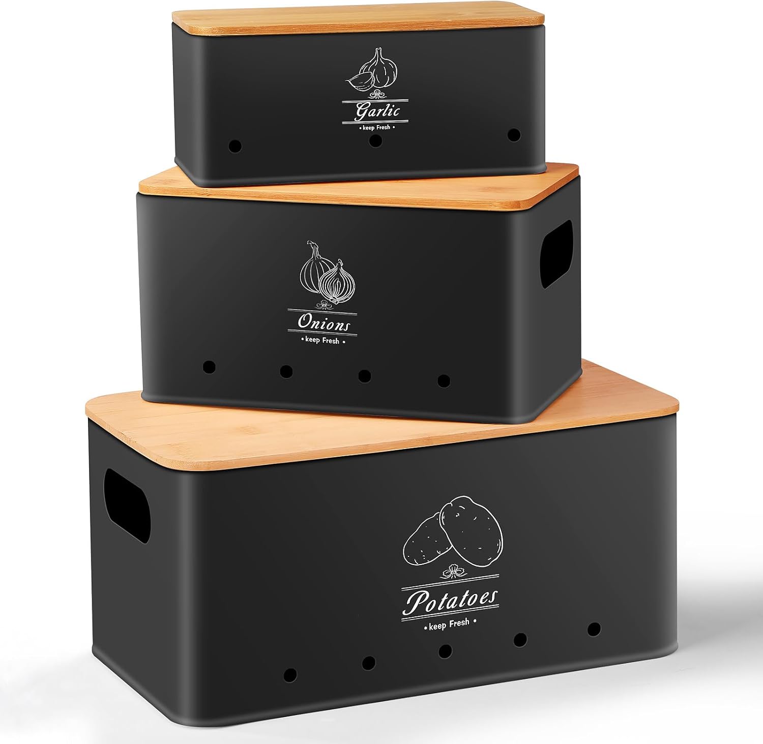 Kitchen Vegetable Storage Set of 3, Sturdy and Durable Storage Basket for Potato, Onion, Garlic, Fruit,Aerating Holes and Wooden Lid (black)