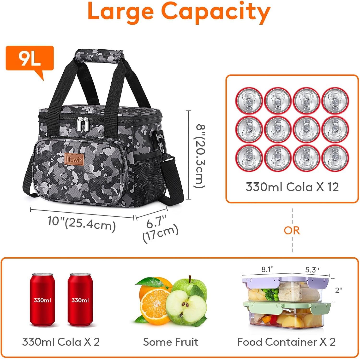 - Large Capacity: Dimensions - 10"(25.4cm) × 6.7"(17cm) × 8"(20.3cm). The maximum capacity of lunchbox for adults is 9L, and is spacious enough to store 12 cans of coke (330ml), or your lunch such as sandwiches, salad, snacks, drinks and fruits and so on. It is suitable for office, for work, picnic, beach, trip.