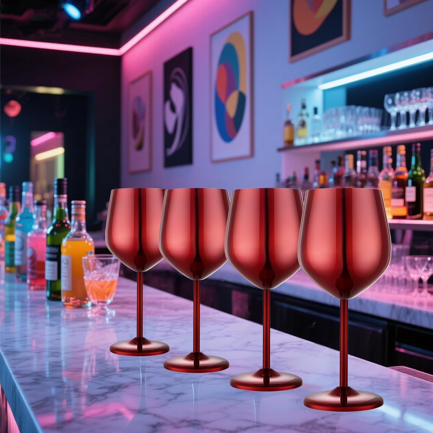 - 【Luxurious & Refined】Hand-polished to perfection, these stainless steel wine glasses feature premium electroplated coloring and a striking metallic finish. With a generous 18-oz capacity and a weighted flat base for superior stability, the sleek stem elevates both elegance and functionality—effortlessly aerate your wine with a graceful swirl