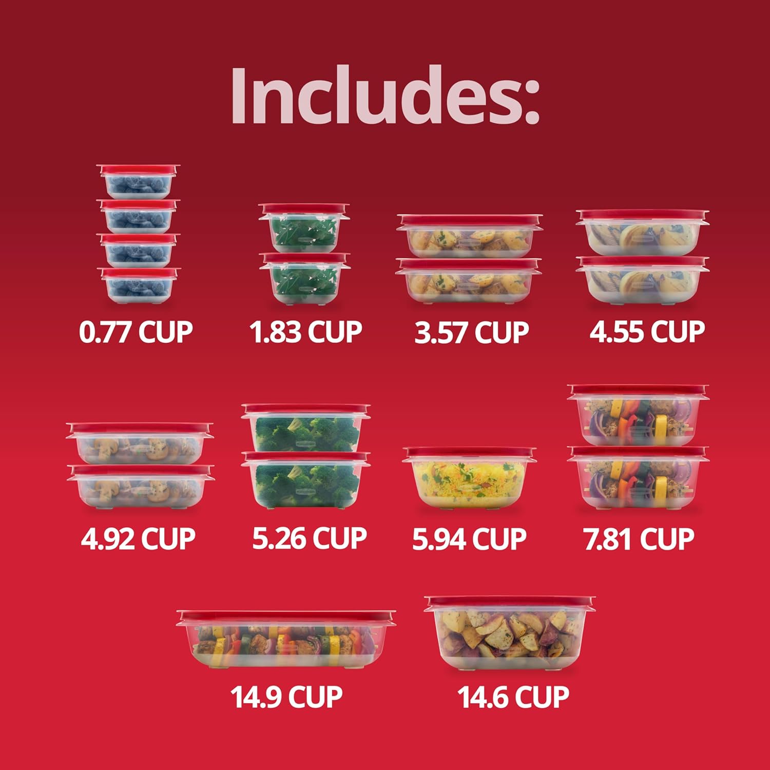 - Multiple Pieces: Includes four 0.77-cup containers and lids, two 1.83-cup containers and lids, two 3.57-cup containers and lids, two 5.26-cup containers and lids, two 4.92-cup containers and lids, two 7.81-cup containers and lids, one 14.9-cup container and lid, one 14.66-cup container and lid, two 4.5-cup containers and lids, and one 5.94-cup container and lid.