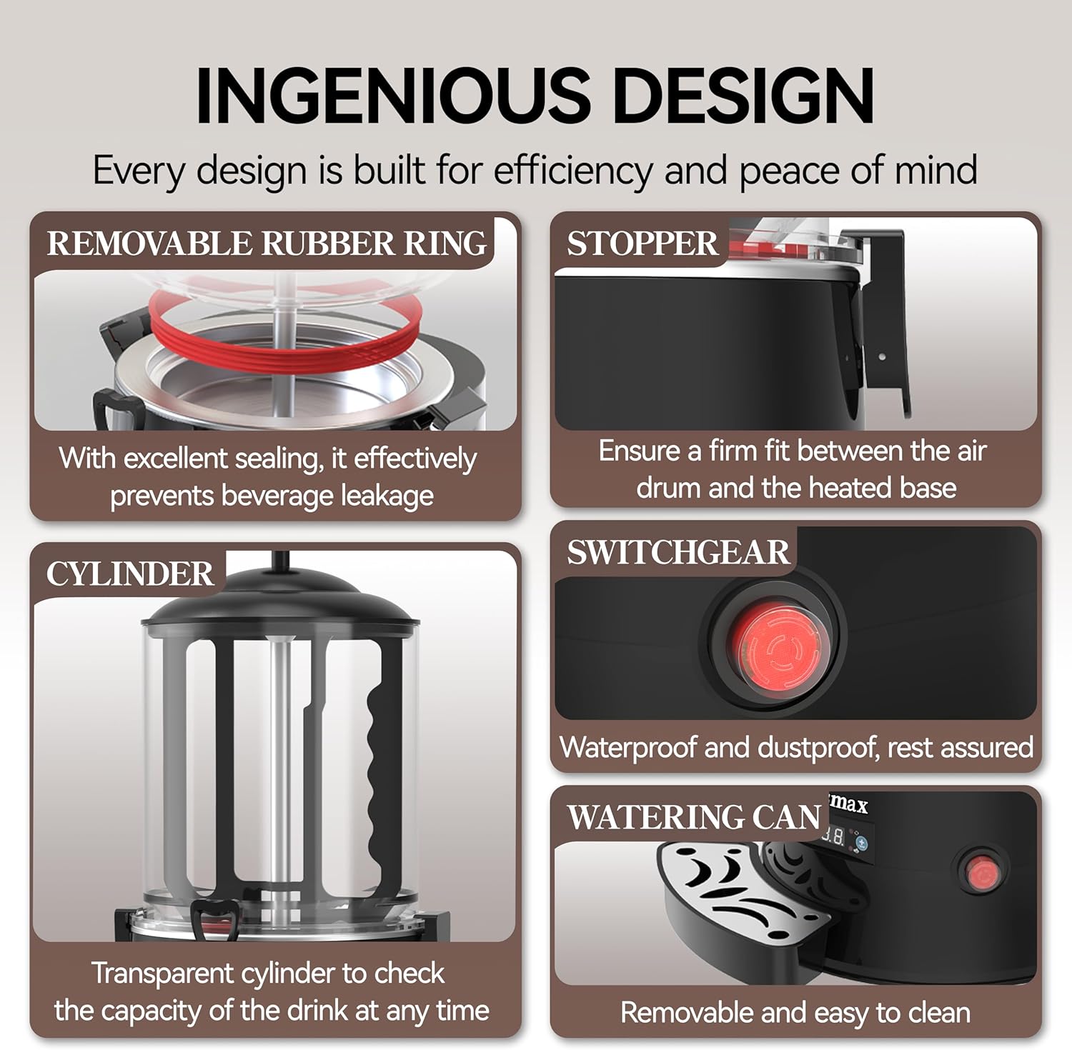 - 【Intelligent Temperature Control】 Vtsmax hot chocolate maker supports a wide temperature range of 30-90℃, intelligent & precise temperature control, set the temperature of the drink according to your needs. LED touch panel one-key operation, stainless steel circulating heated plate uniform heat conduction, to prevent the hot drinks from settling &layering, to maintain the best taste
