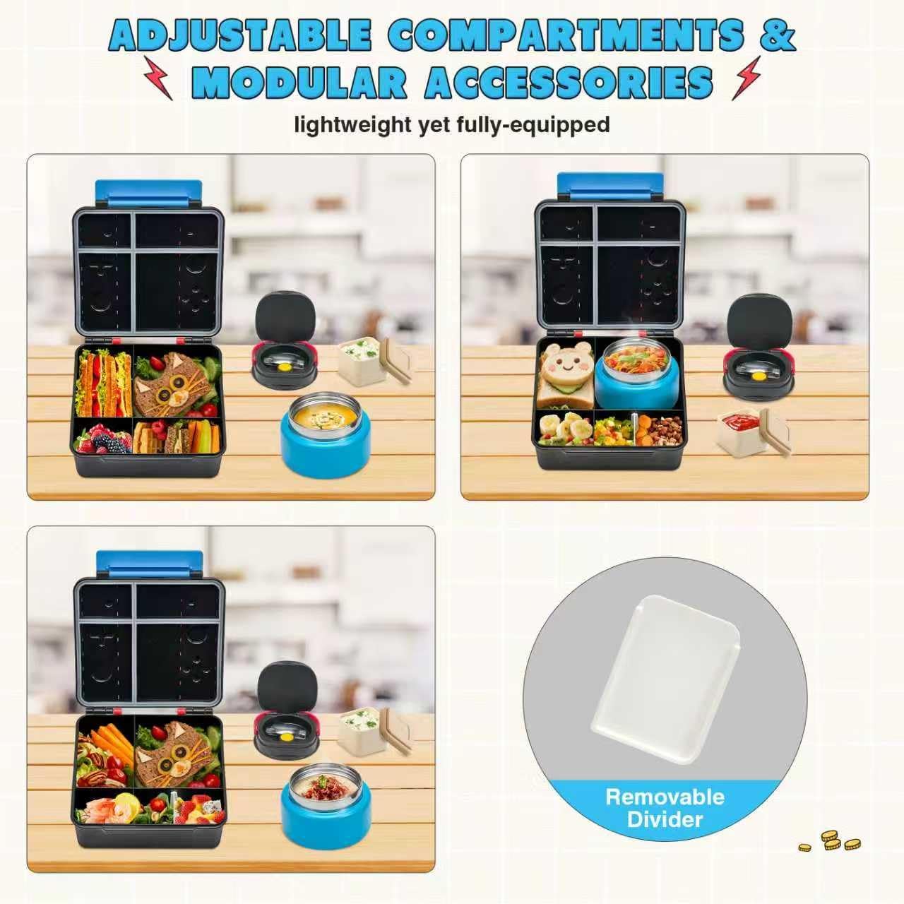 - Multi Compartment Design: Our lunch box have dividers and sauce cups, and removable dividers allow you to customize the compartments for sandwiches, fruit, snacks, or regular meals. Individual sauce cups won't allow sauce to spill onto other foods and meals will be more flavorful! The perfect kids lunch box for school, traveling or picnics!