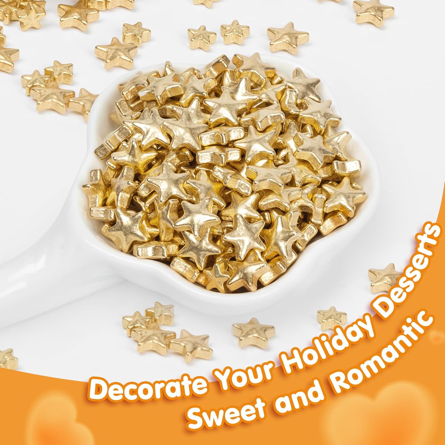 - Luxurious Gold Star Sprinkles:These bright Gold star sugar sprinkles mixes are classy for wedding and birthday cakes,holiday baking and decorating.These star sprinkle mixes are classy for birthday cakes,holiday baking and decorating anniversaries,Halloween, Christmas, New Year’s,Valentine's Day and other special occasionsAnd you can also use them to embellish cookies,cupcakes,ice cream,fondant and pastries for added allure.secorating your favorite baked dessert with our mixing-sized lustrous Gold Star Sprinkles will surely elevate your presentation,and more to add party fun