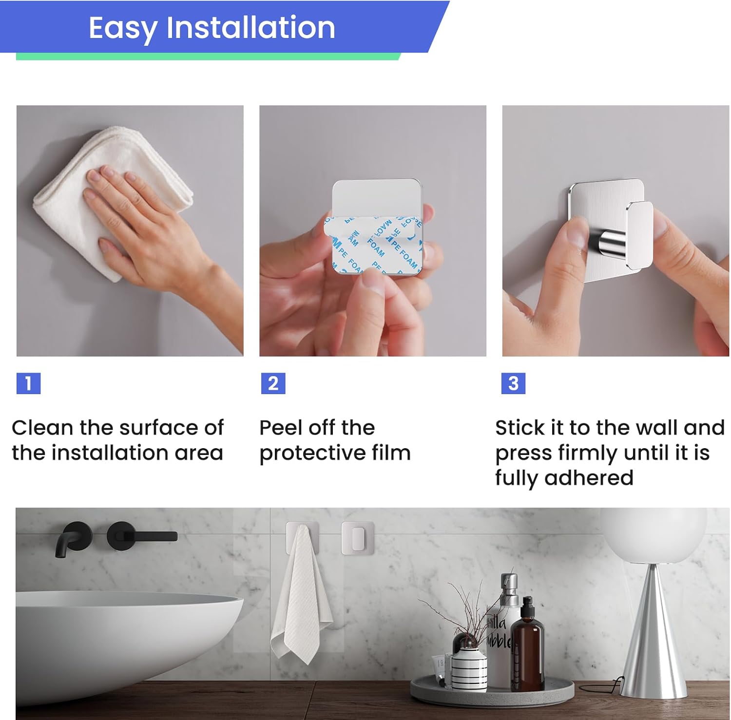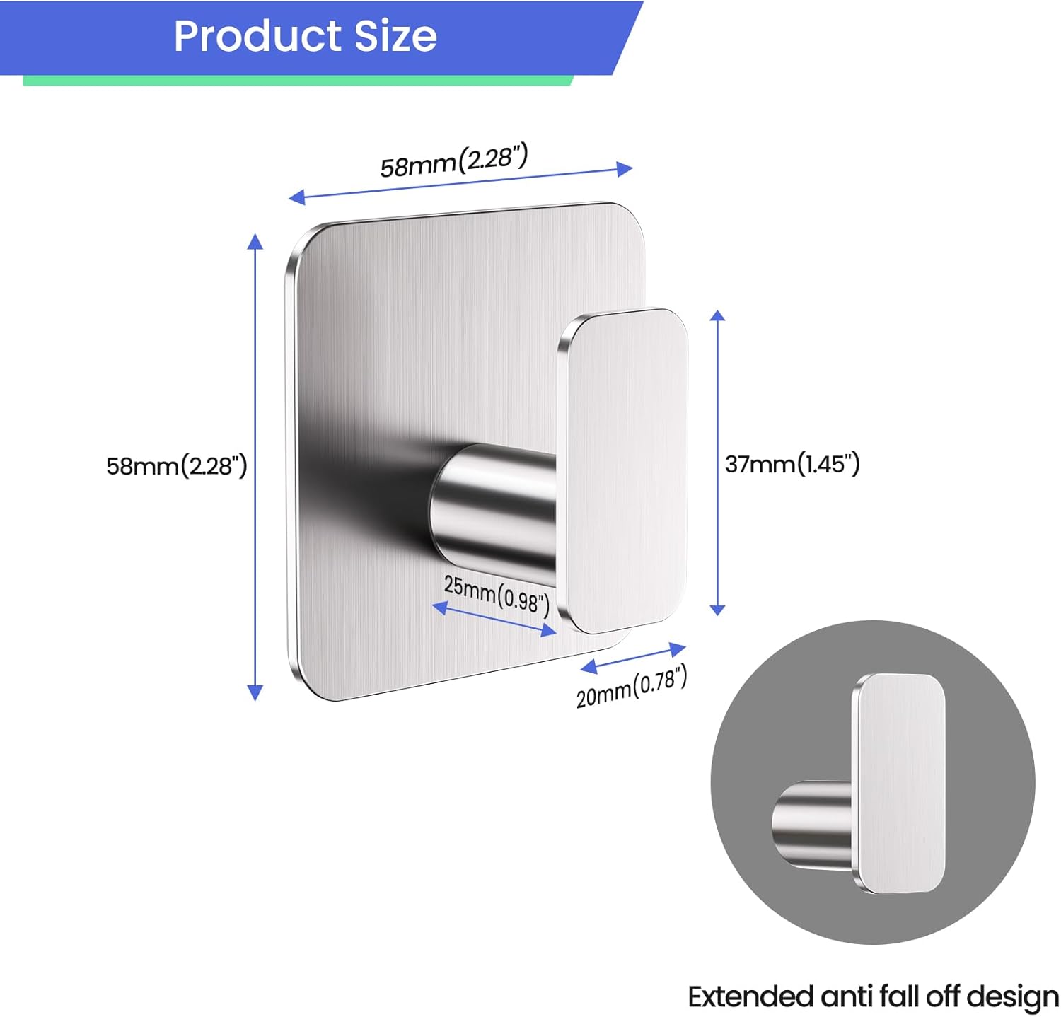 - 【304 Stainless Steel - Waterproof and Rustproof More Durable】 Sticky hooks are made of high quality 304 stainless steel, the surface of the frosted process is scratch-resistant and wear-resistant, waterproof and moisture-proof and rustproof, the bathroom, shower, kitchen, balcony and other humid environments can be used for a long time, goodbye to the ordinary hooks are easy to oxidize the trouble of breakage.