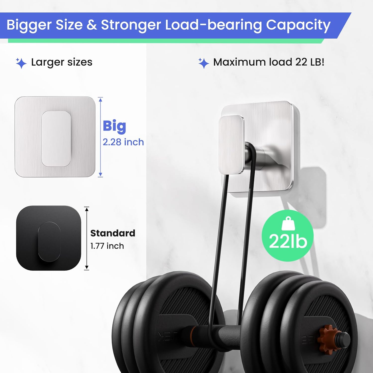 - 【22lb Super Strong Load Capacity】 Wall hooks maximum load capacity up to 22lb/10kg, solid bonding does not fall off, strong adhesive backing can be firmly affixed to tiles, glass, marble, wood and other smooth surfaces, easy to hang toolboxes, kitchen pots and pans, and other heavy objects, do not need to worry about the risk of falling.