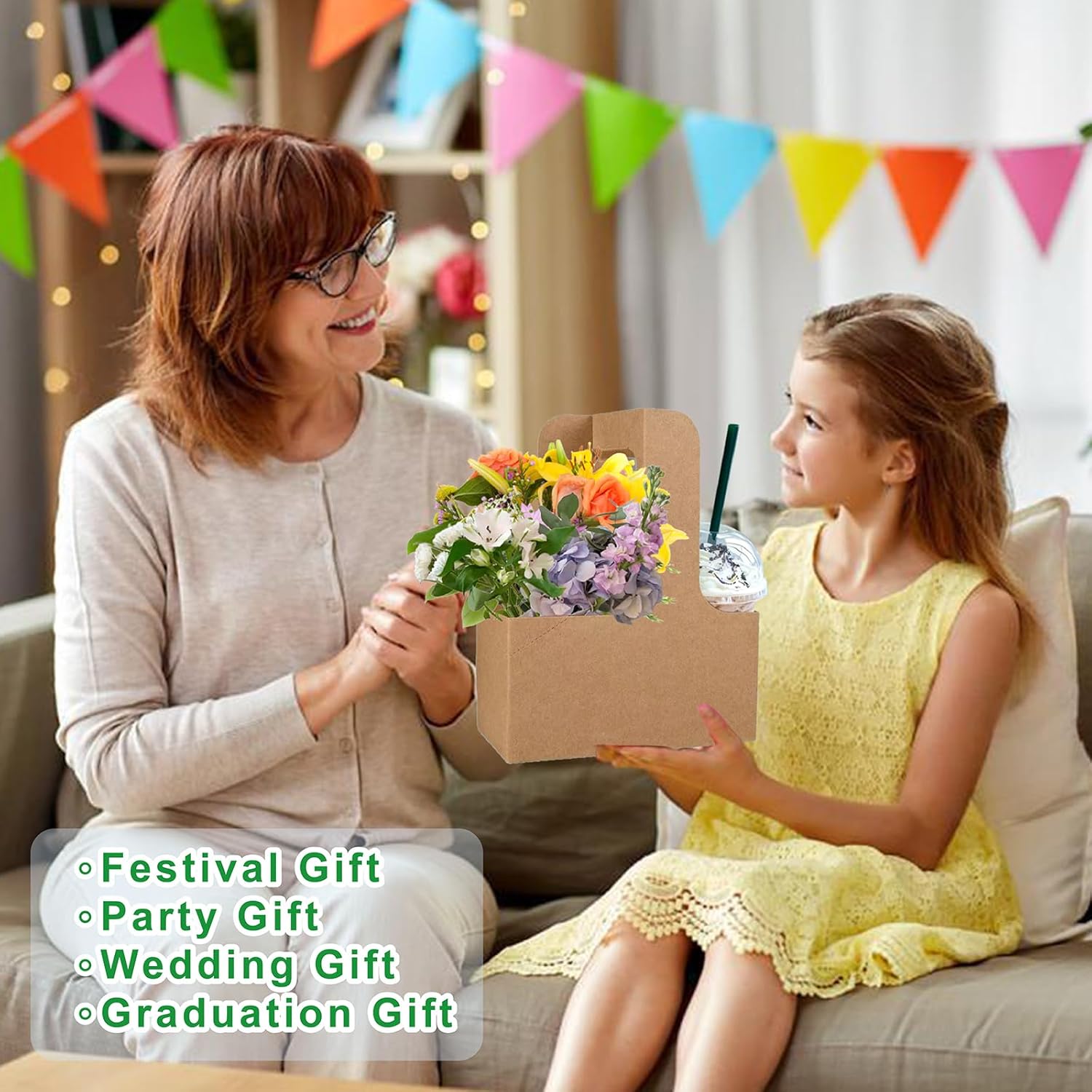 50PCS 2 Cup Disposable Drink Carrier with Handle, Floral Wrap Packing Gift Box, Portable Take Out Cup Carriers for Delivery Coffee Beverage, Kraft Paperboard Cup Holder for Hot or Cold Drinks