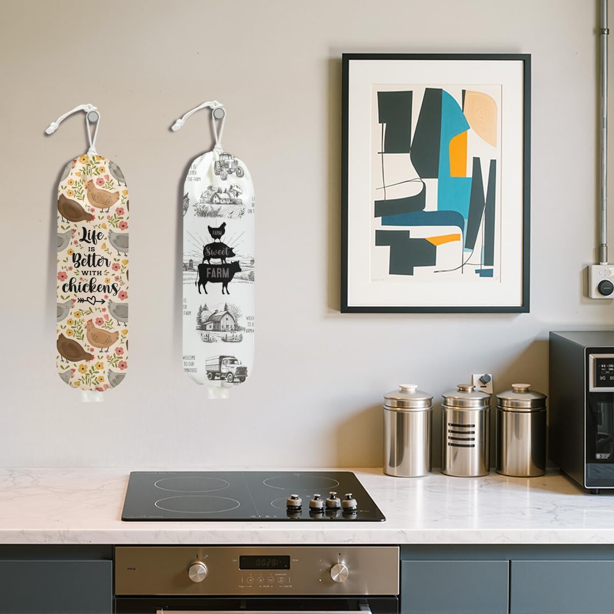 2Pcs Rustic Sweet Farm Plastic Bag Holder for Kitchen Essentials, Wall Mount Grocery Bag Holder for Plastic Bags, Chicken Floral Reusable Grocery Bags Storage Dispenser for Home Kitchen Farmhouse
