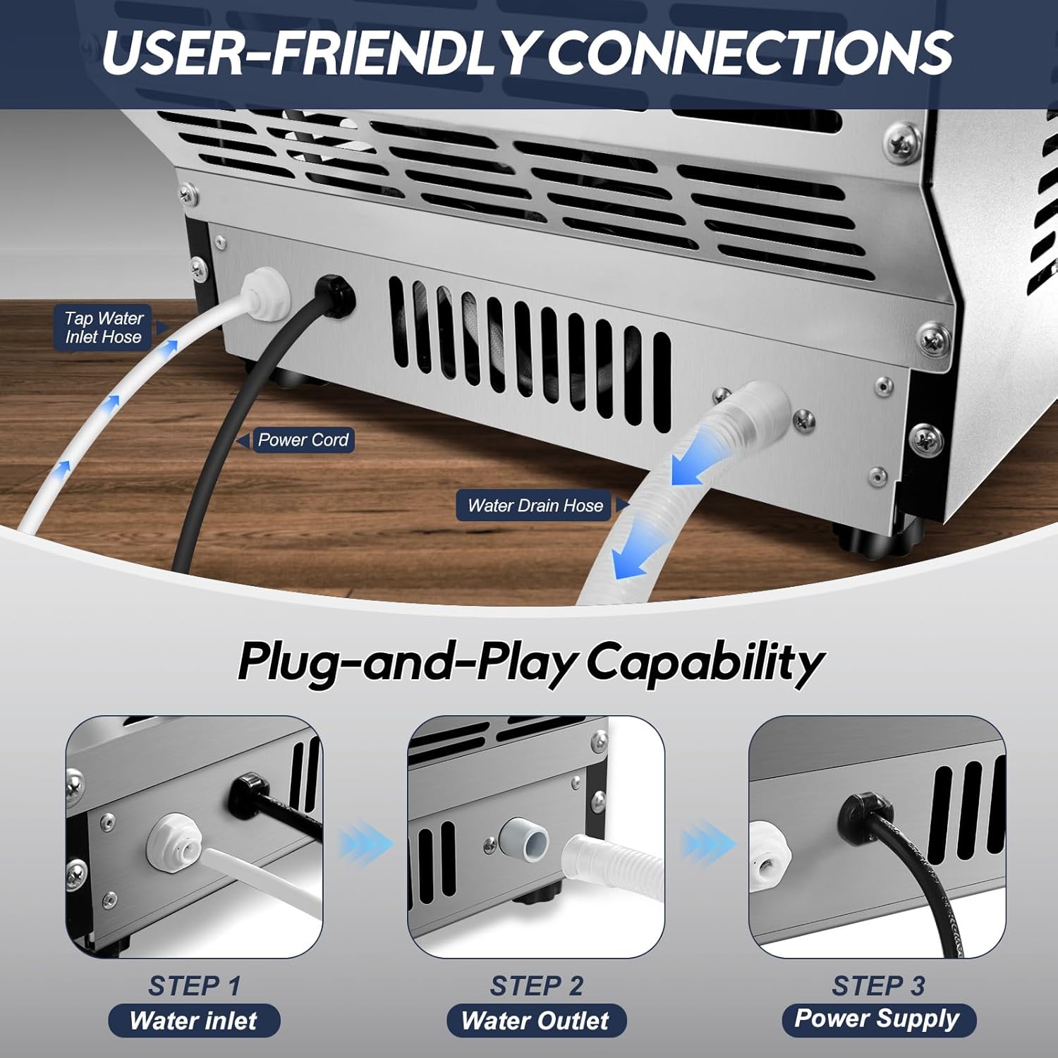 - 【Plug and Play · Easy Installation】 - It comes with a water inlet pipe, a drain pipe, a quick connector and an ice shovel. Just connect the pipes and the machine can automatically fill, drain and start the ice making cycle, eliminating the tedious manual operation and easy to use.