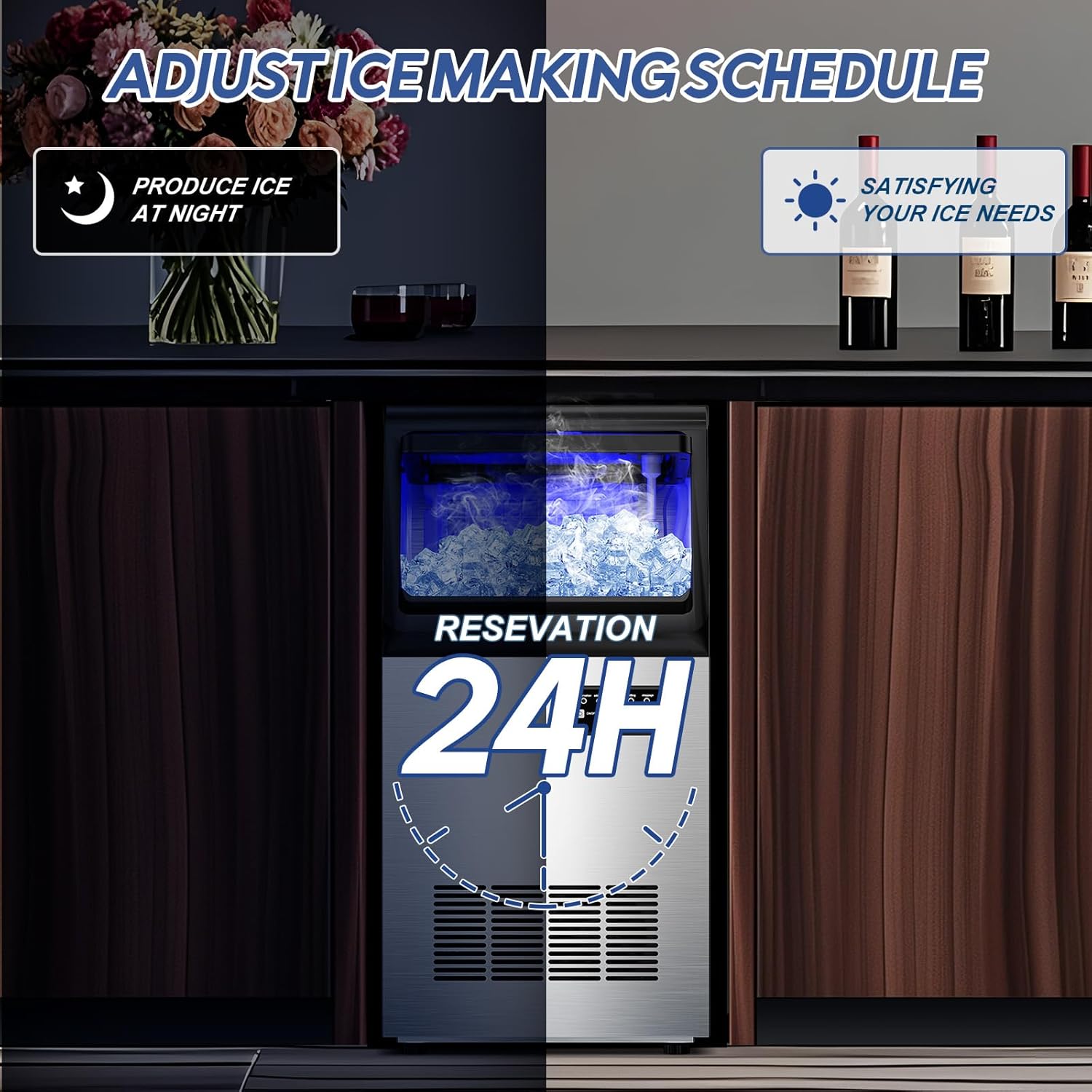 - 【Smart Control · Multi-Function Panel】- Easily control all functions through the one-touch LCD control panel: 24-hour reservation, automatic cleaning, blue light lighting, defrosting function and fault prompts are all available. You can also adjust the ice making time and customize the ice thickness as needed.