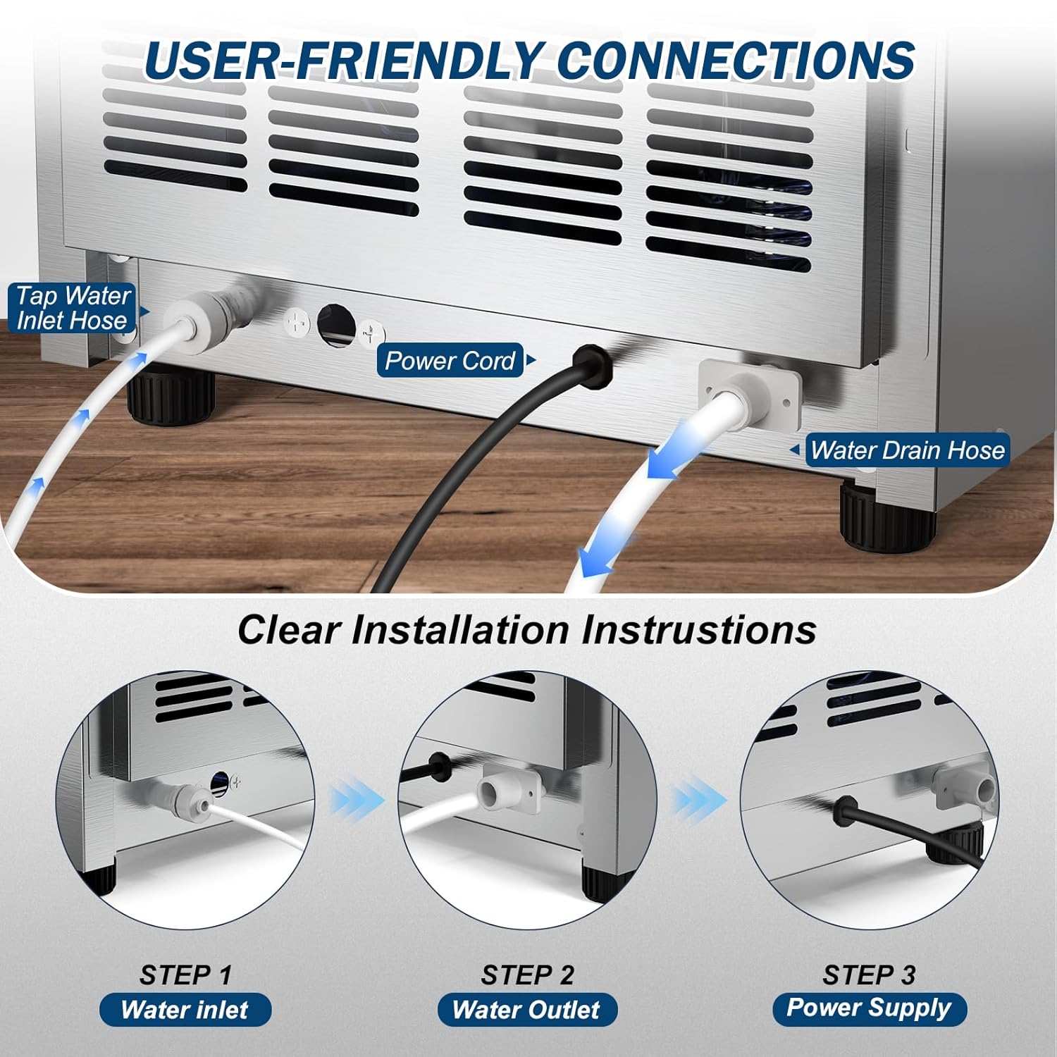 - 【Effortless Setup with Full Accessories Included】This ice maker includes everything you need: inlet hose, drain hose, quick-connect fitting, premium water filter, and ice scoop. Just connect the hoses—the machine fills and drains automatically, making the setup process hassle-free.