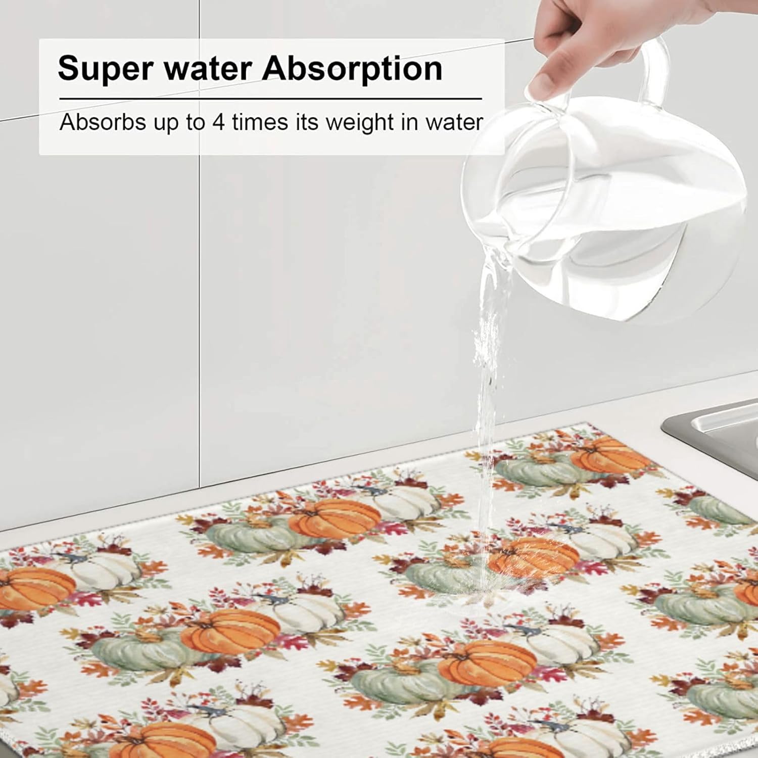 Fall Dish Drying Mat 18x24 for Kitchen Counter, Watercolor Pumpkin Leaf Decorative Absorbent Coffee Mat Dish Drying Pad Coffee Bar Dish Drainer Rack Mat Drainer Mat