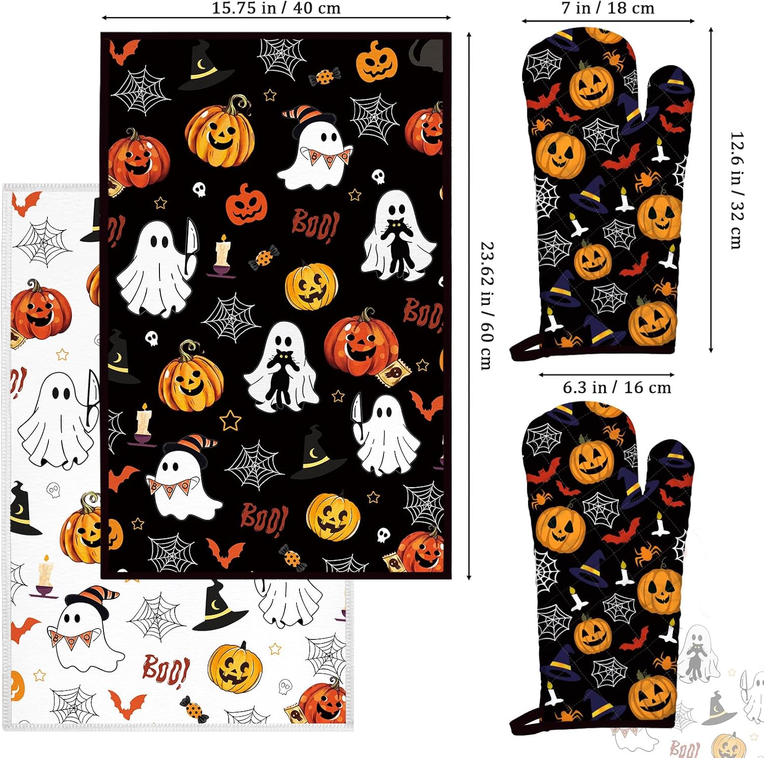 Halloween Pumpkin Kitchen Towels and Oven Mitts Set 4Pcs, Soft Absorbent Dish Cloth Heat Resistant Oven Gloves for Cooking Baking Kitchen Decoration, Gifts for Her