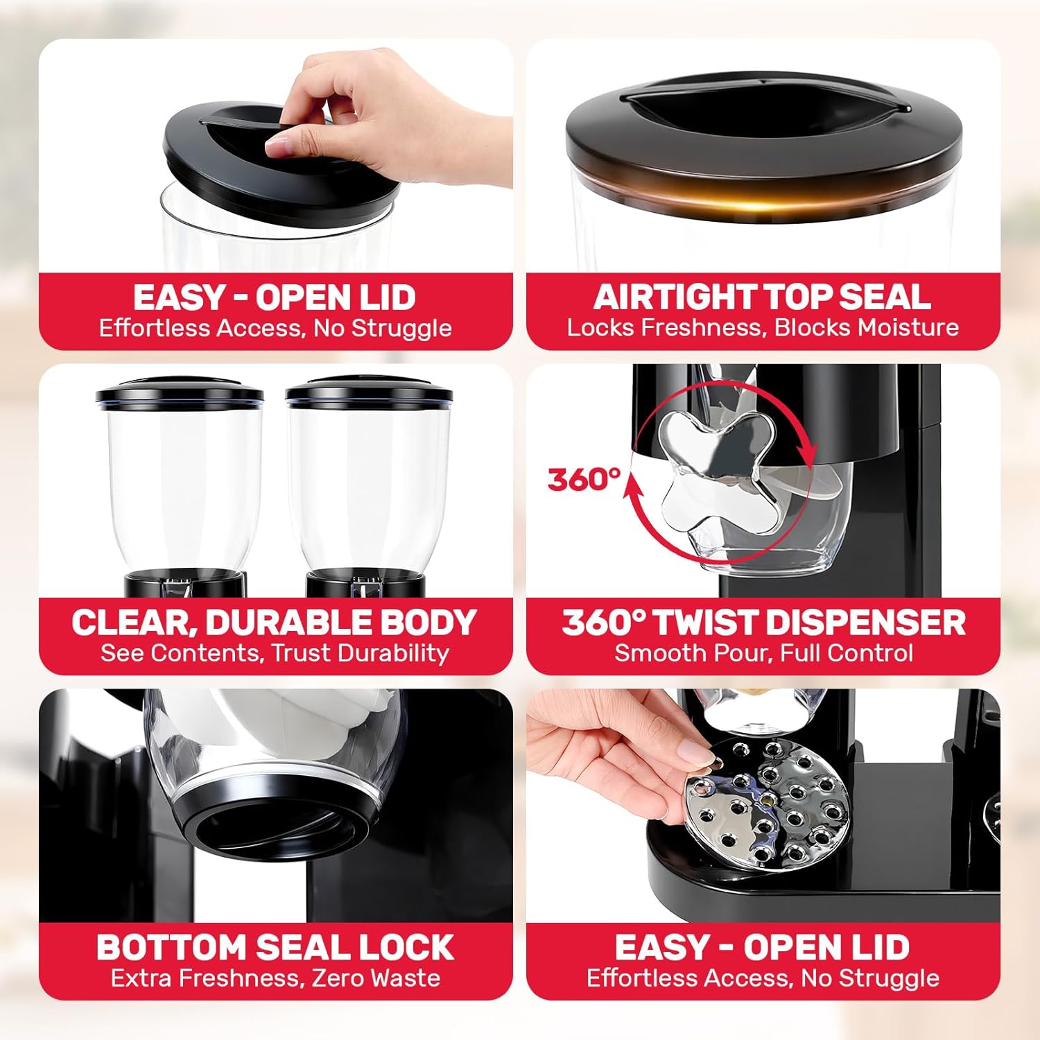Dual-Control Cereal Dispenser Countertop, 2 Pack 2L Cereal Containers Storage with Airtight Lids, Rotating Dispenser for Pantry, Cereal, Dry Food, Candy, Rice, Grains, Coffee Bean