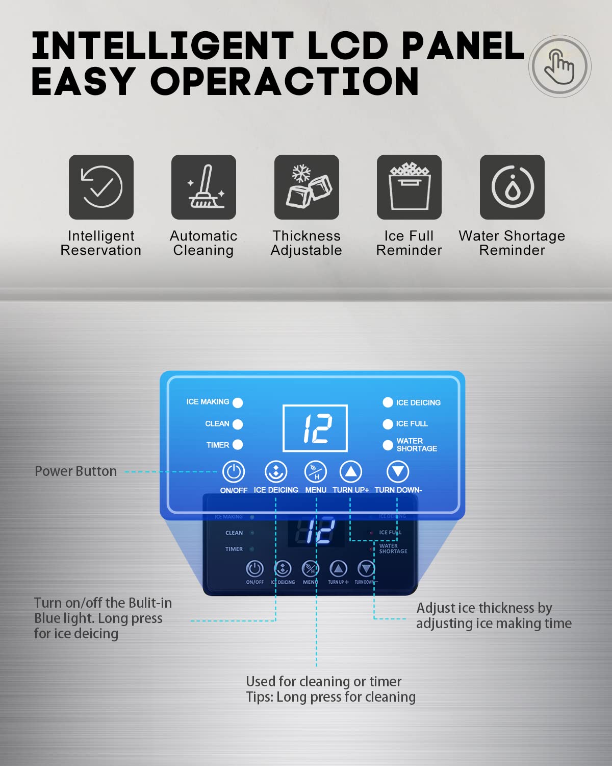 - 【Smart LCD Control Panel with Multi-Functions】Enjoy full control with an intuitive LCD display, offering one-click operation for: 24-hour、timer reservation、Automatic self-cleaning 、De-icing function、Built-in blue light, Malfunction alert. Adjust ice-making time (+/-) to control cube thickness and tailor ice to your needs.