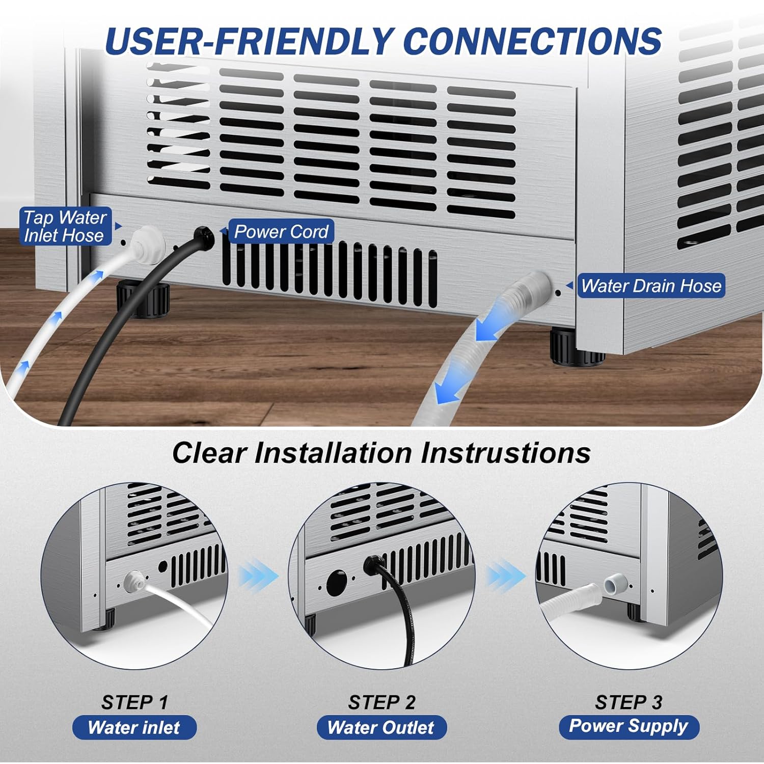 - Easy Setup with Full Accessory Kit - Comes with everything you need: water inlet hose, drain hose, quick connector, premium water filter, and ice scoop. Simply connect and the machine automatically fills and drains.