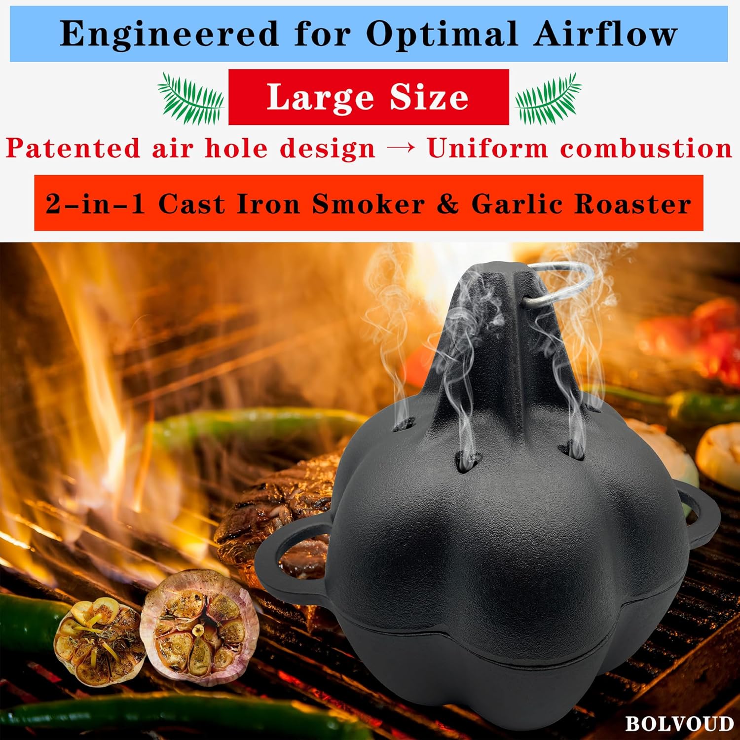 - ❤【All-in-One Cast-Iron Garlic Roaster for Smoker】 SIZE: 10.2 x 7.8 x 8 inches, BOLVOUD Cast Iron Smoker Roaster doubles as a garlic roaster, offering you a BBQ accessory that smokes and roasts with excellence. It's perfect for adding smoky flavors to garlic, mushrooms, vegetables, meats, and more using blends of wood chips, herbs, and spices.
