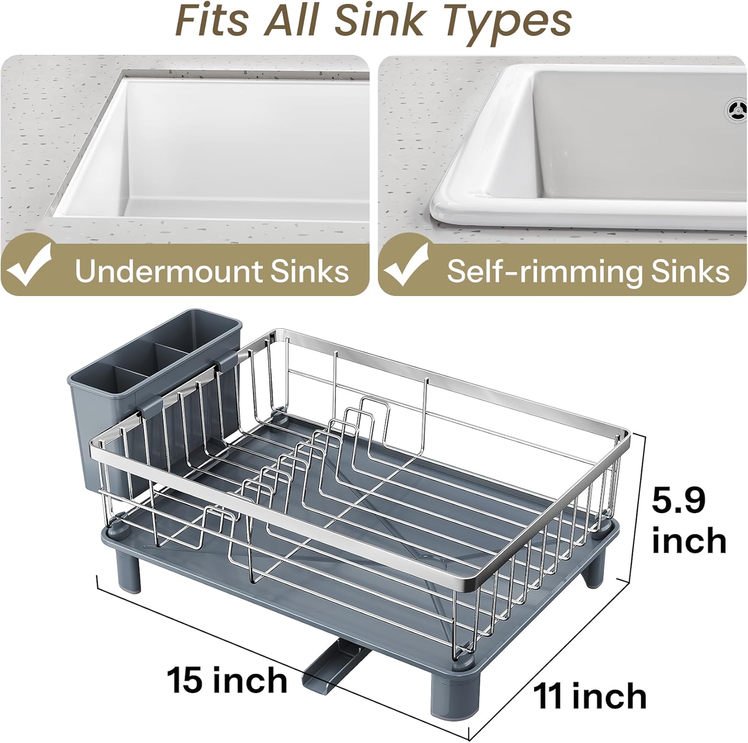 - Non-Slip & Universally Compatible: The anti-slip silicone caps keep the dish rack securely in place while protecting your countertop from scratches. The elevated legs (1.75" H) are designed to fit various sink types, ensuring smooth drainage without any leakage