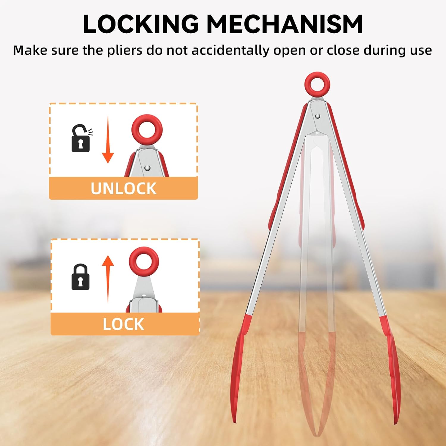 - EASY TO STORE: Kitchen tongs have a locking mechanism to ensure that the tongs will not be accidentally opened or closed during use, pull the ring to lock and push to unlock, giving you better control over cooking, and the operation is super simple. Hang them with the hanging ring after use or lock them by pulling the ring and put them in the drawer, saving space.