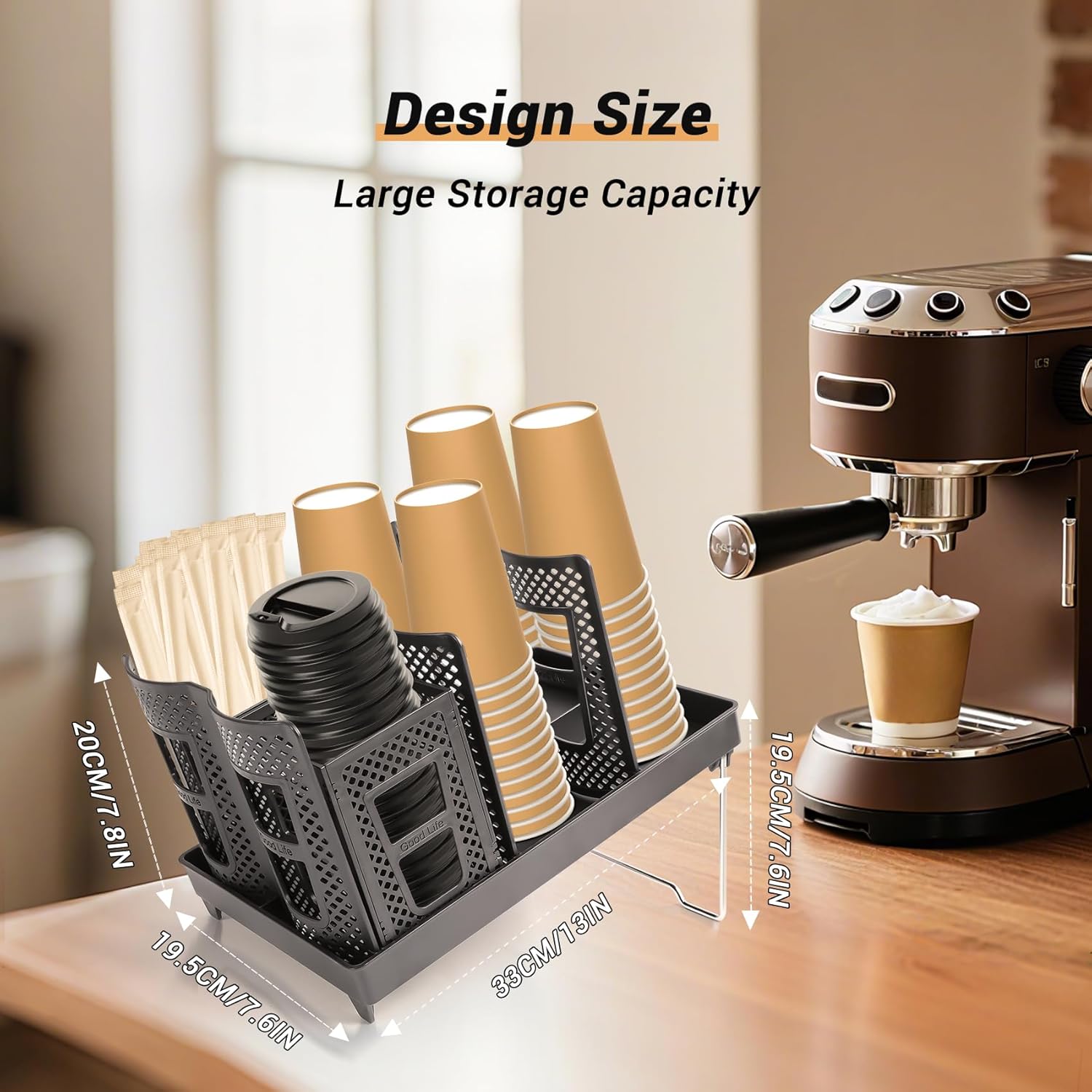 - Space Saving - The coffee cup organizer for countertop stores cups and lids to avoid the clutter caused by placing them everywhere, saving space and increasing efficiency, maximizing your available space