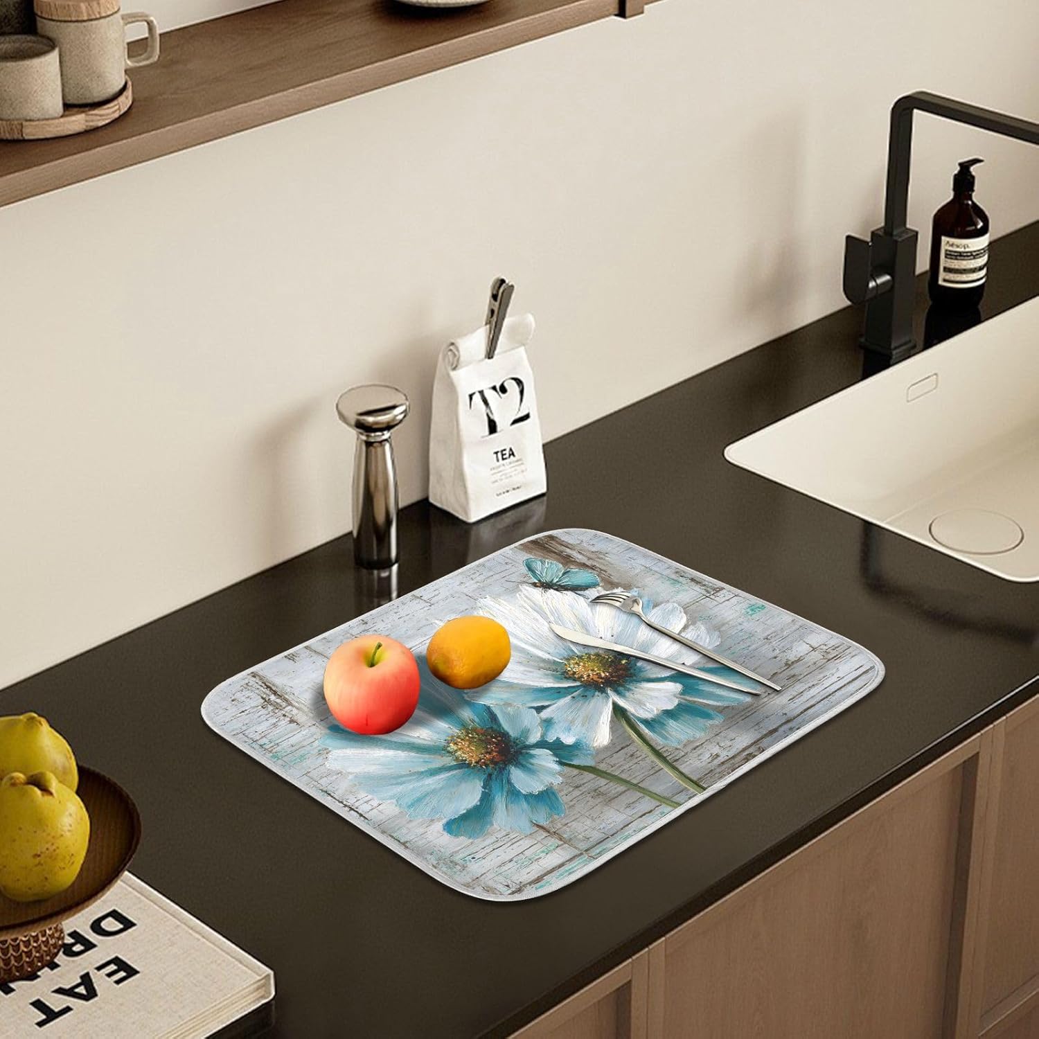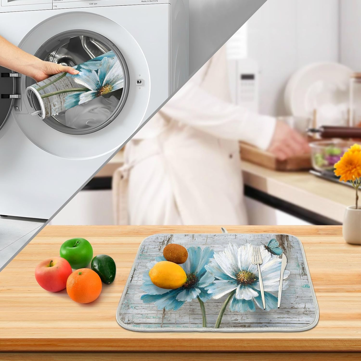 - Exquisite workmanship: This dish drying mat with durable and neatly sewing around the edge helps contain spills, the stitches don't fall off so that they are reversible for convenience and optimal performance, but one-sided printing, matchs delicate dishes and stemware, bring decorations to your home or kitchen, keeping tables clean, the soft and foldable material is easy to store, this dry pad has a lanyard design, which can be hung up when you are not in use and does not take up space