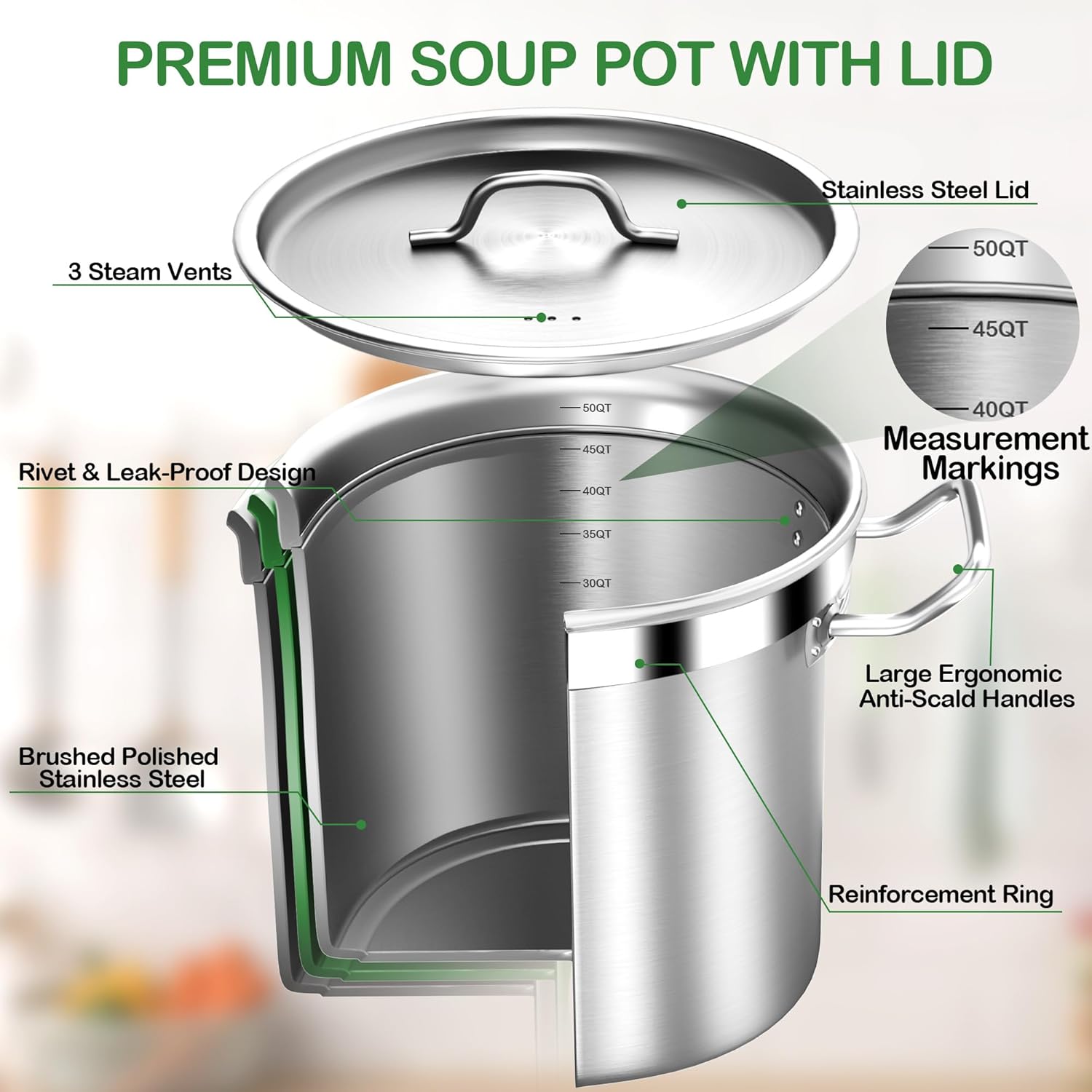 50 Quart Stainless Steel Stock Pot with Lid – Heavy Duty Cooking Pot for Soup, Commercial Soup Pots, 3-Ply Induction Bottom, Oven Safe