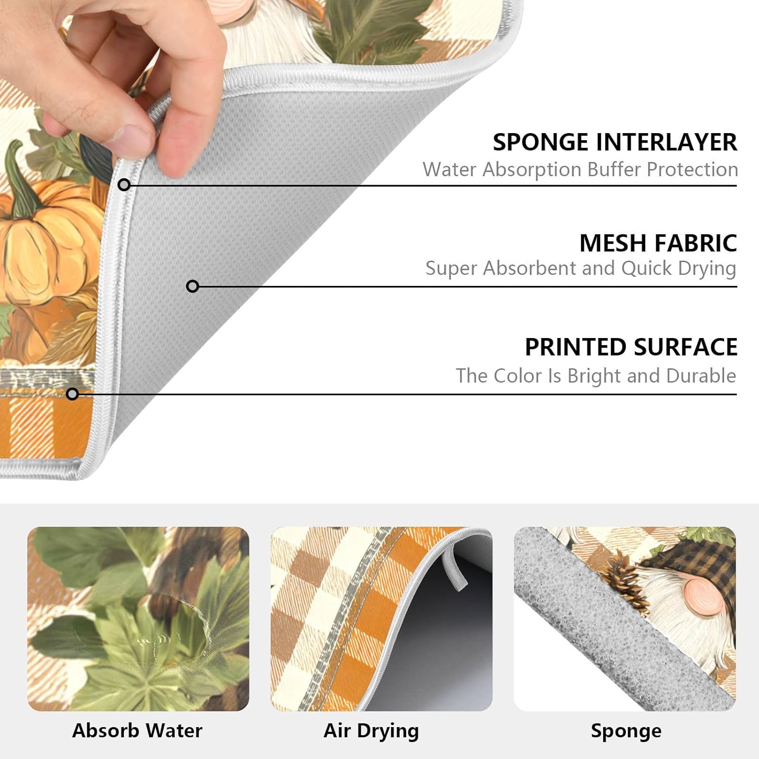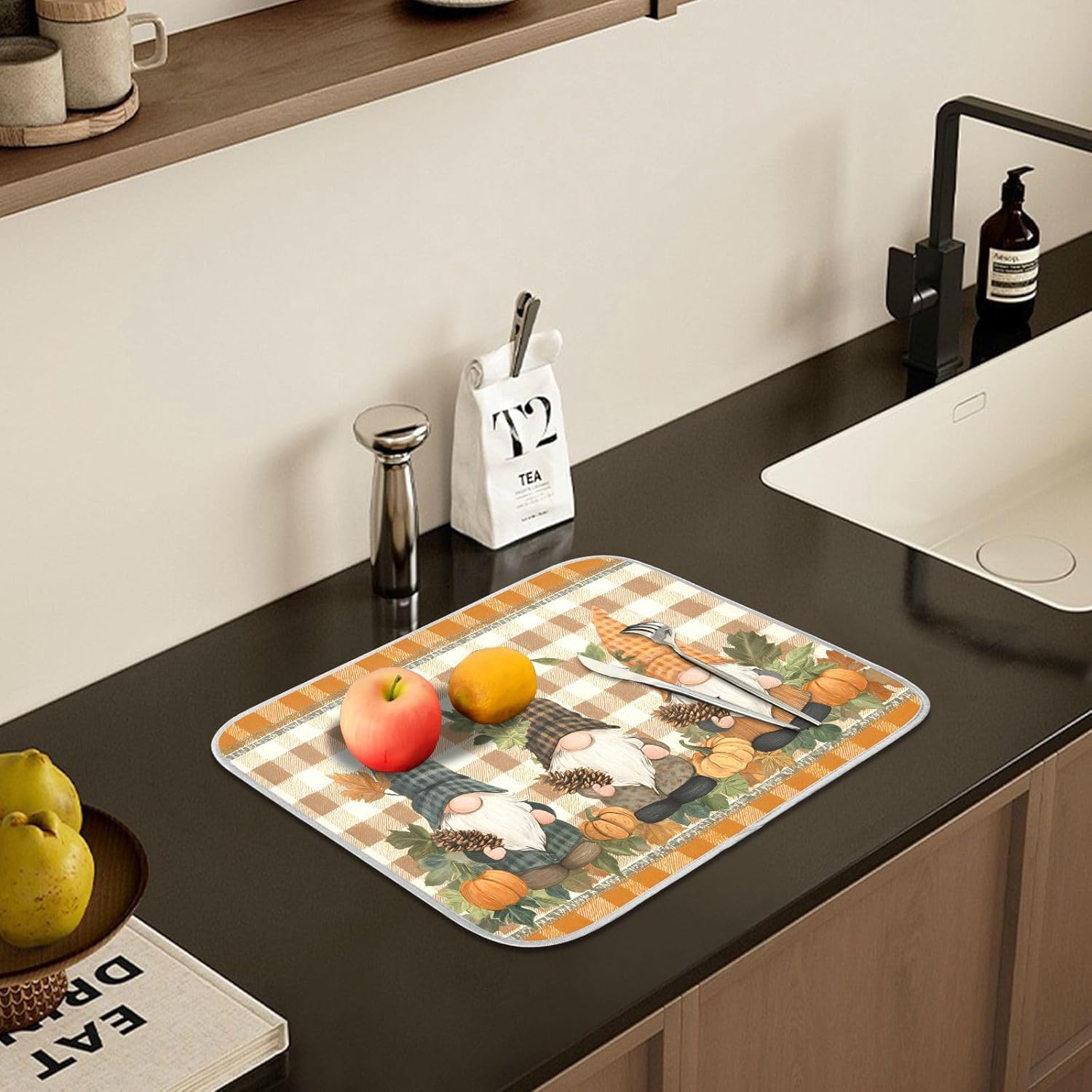 Fall Pumpkin Gnomes Maple Leaves Autumn2 Dish Drying Mat for Kitchen Counter Absorbent Microfiber Small Drying Pad Dish mats for Kitchen Countertops 16 x 18 Inch