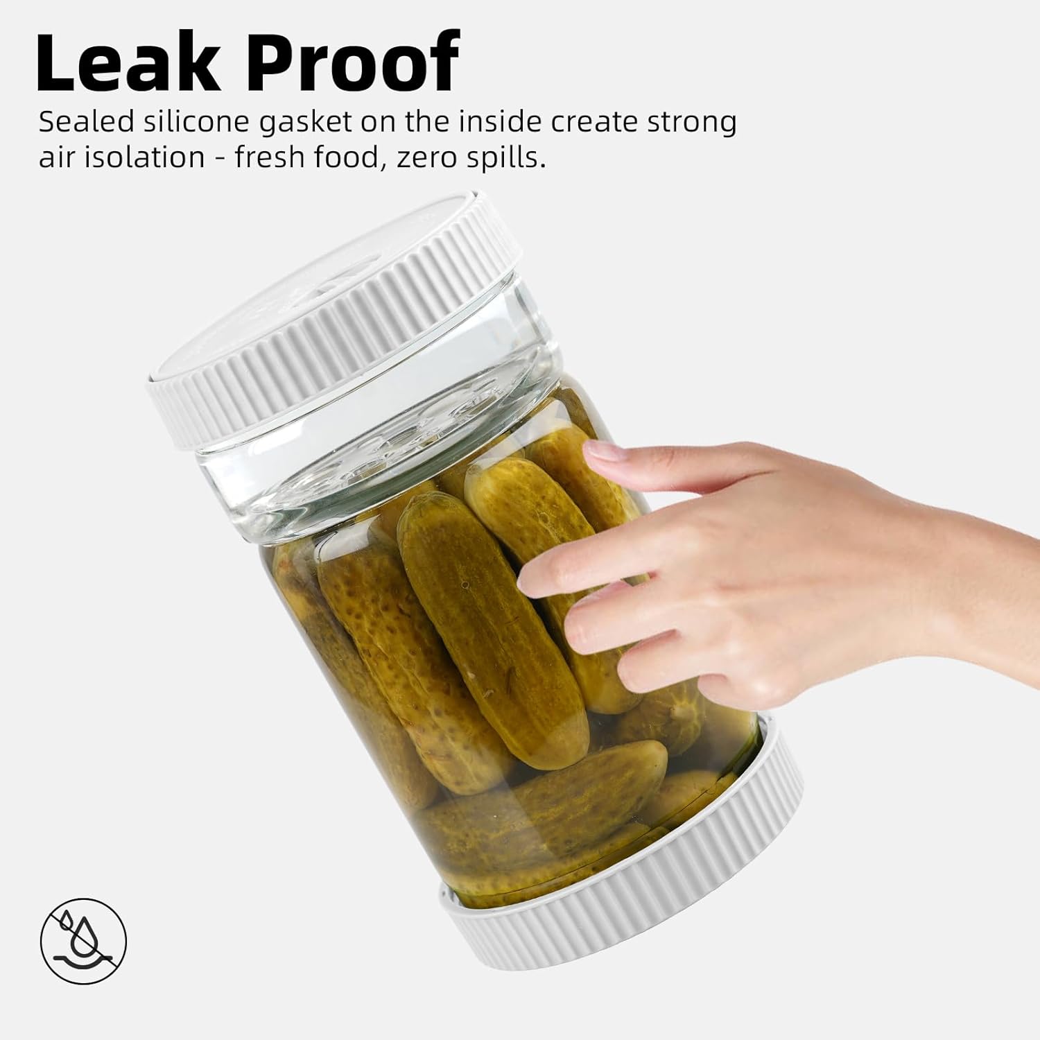 - Glass Strainer & Leakproof: Features an integrated glass strainer, molded into the jar body. Smooth glass strainer resists odors and minimizes residue buildup. Our pickle jars feature a dual design of threaded lids + silicone sealing ring to prevent leakage during turning or refrigerator storage. 4-inch wide mouth allows effortless loading of jalapeños, olives, and cherry tomatoes. Make sure the lids are aligned and tightly closed before turning