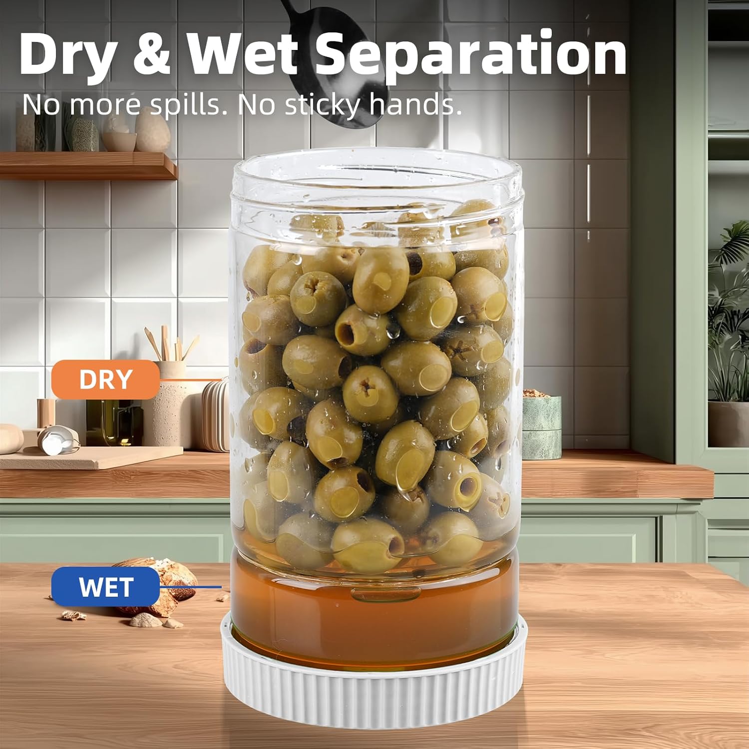 - Pickle Juice Separation: WENHHUUA pickle flip jar features a double-layer design that separates pickles from pickle juice. When flipped, liquids quickly flows through the glass strainer into the base, instantly yielding drained pickles and olives. This eliminates messy dripping and sticky hands during use. Simply reverse the jar to re-immerse pickles in brine, preserving crispness and flavor. Pickles jar are useful tool for pickle enthusiasts.