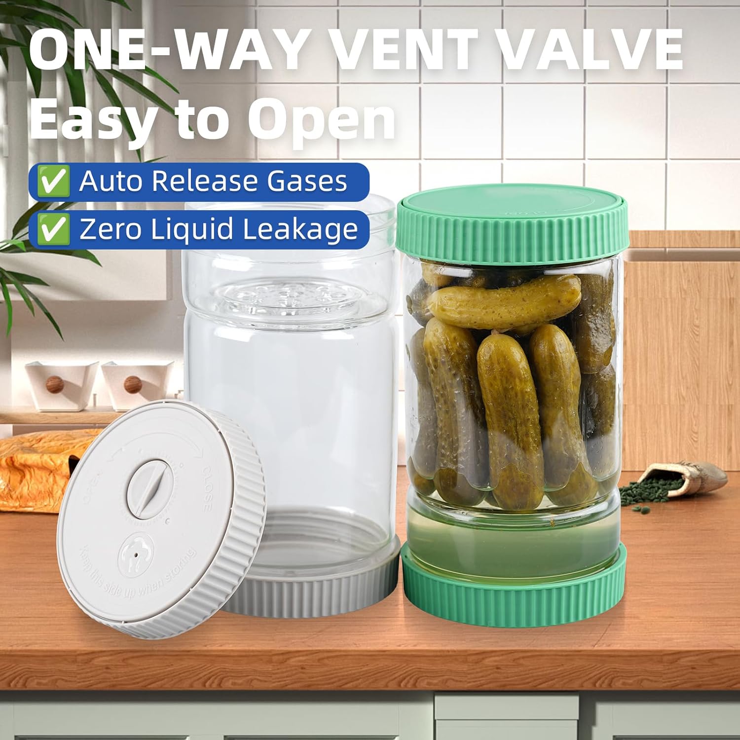 - Easy Opening & Safety: Designed a one-way venting valve on the lid that allows accumulated fermentation gases to escape slowly while stopping liquid leakage, reducing the risk of jar bursts and helping the lid open more easily. Additionally, the lid of the pickle container includes a date dial to help you track the pickling time, ensuring optimal flavor development. Note: Ensure the lid is facing upward to enable gas release