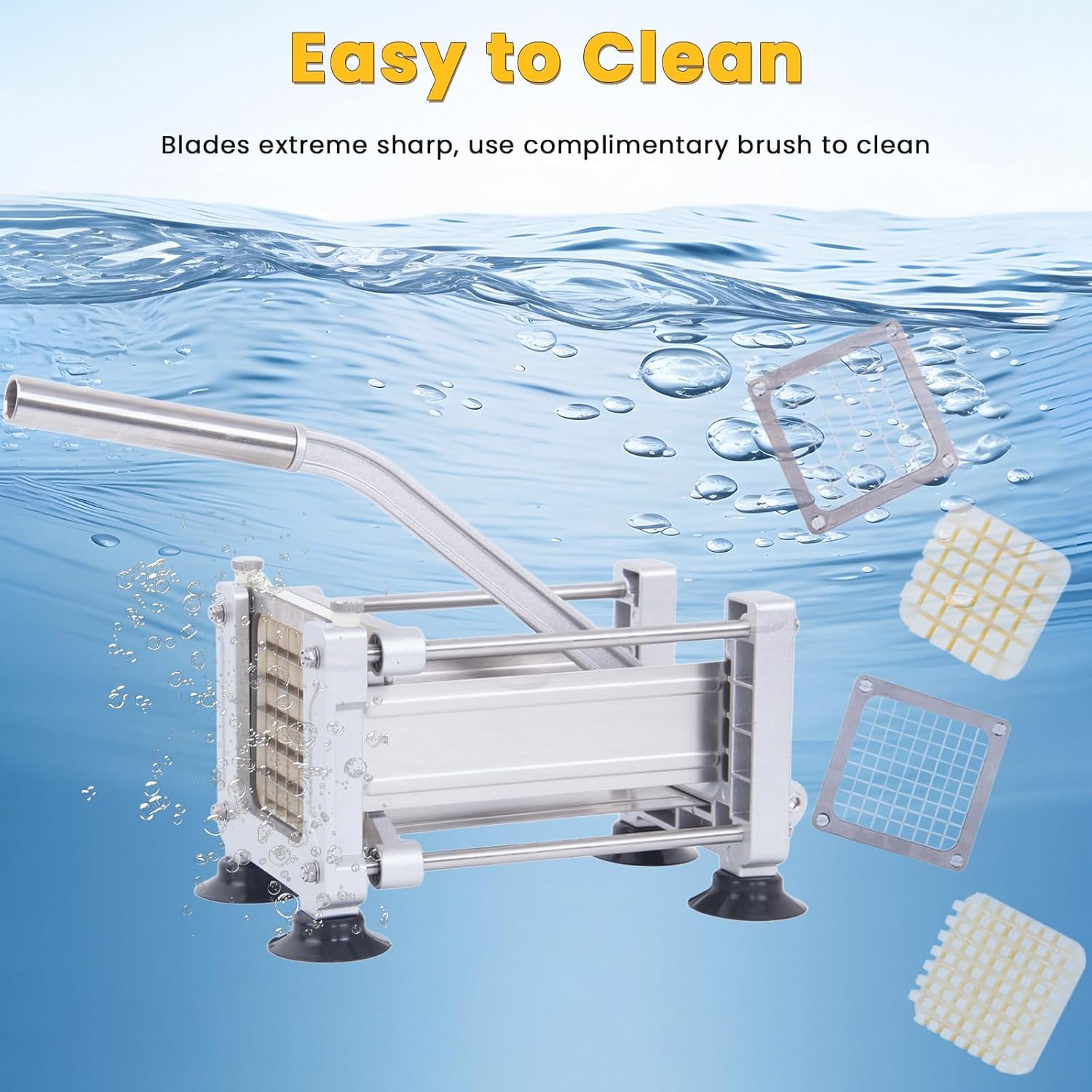 - 3 SHARP STAINLESS STEEL BLADES – Comes with three interchangeable blades (1/4" Shoestring, 3/8" Classic, 1/2" Wide Fry) for restaurant-quality fries every time. Easily switch sizes for any recipe or preference.