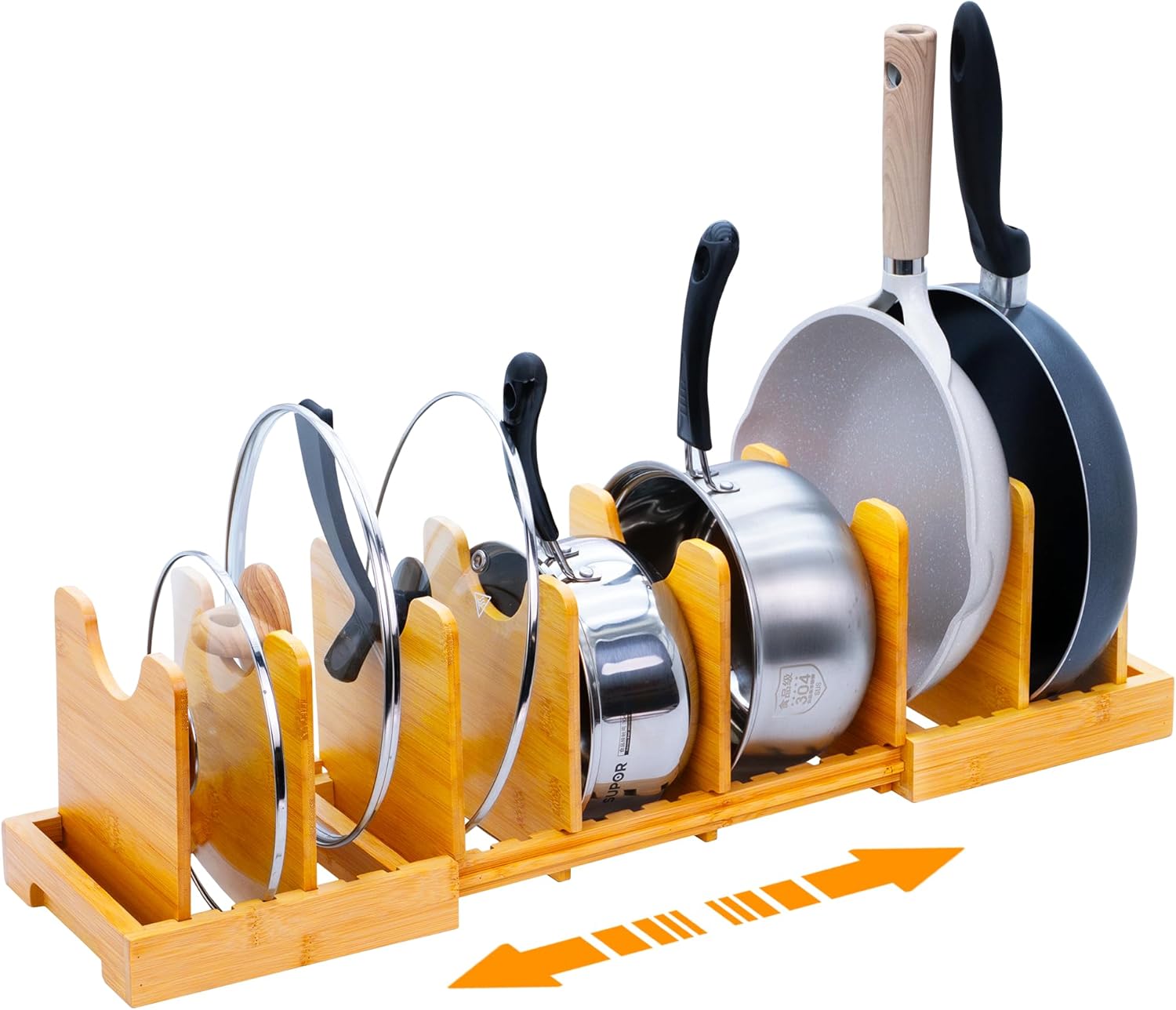 MinBoo Bamboo Expandable Pot Lid Organizer Pot Lid Holder, Pot and Pan Organizer Drawer Organizer for Pot Lids, Adjustable Dividers for Kitchen Cabinet Organizers and Storage,Small