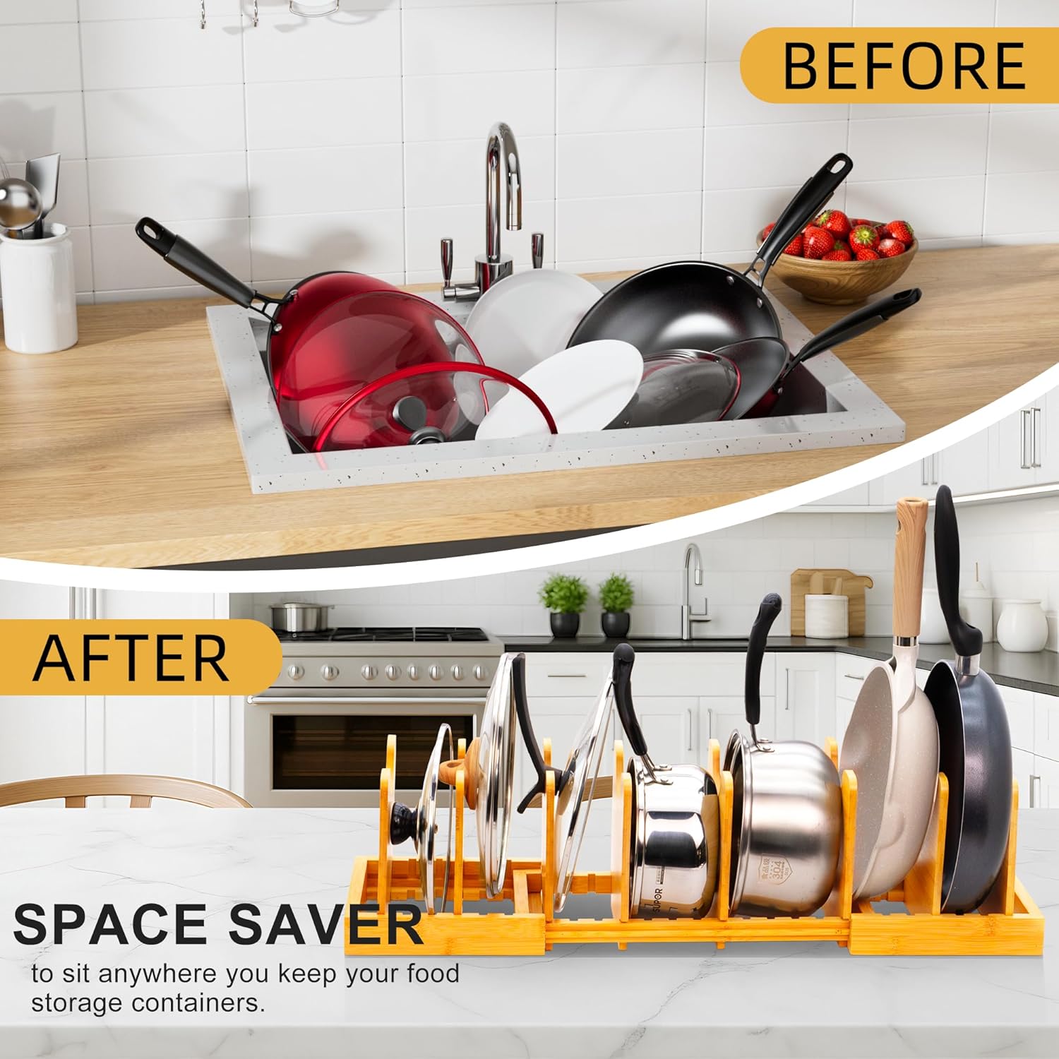 - Durable and Safe Material: It is made of natural bamboo products. The stand is better upgraded, more durable and stable to hold heavier cookware. Natural bamboo products can better match the cookware and style of the kitchen,The smooth surface can protect your kitchen items from being scratched
