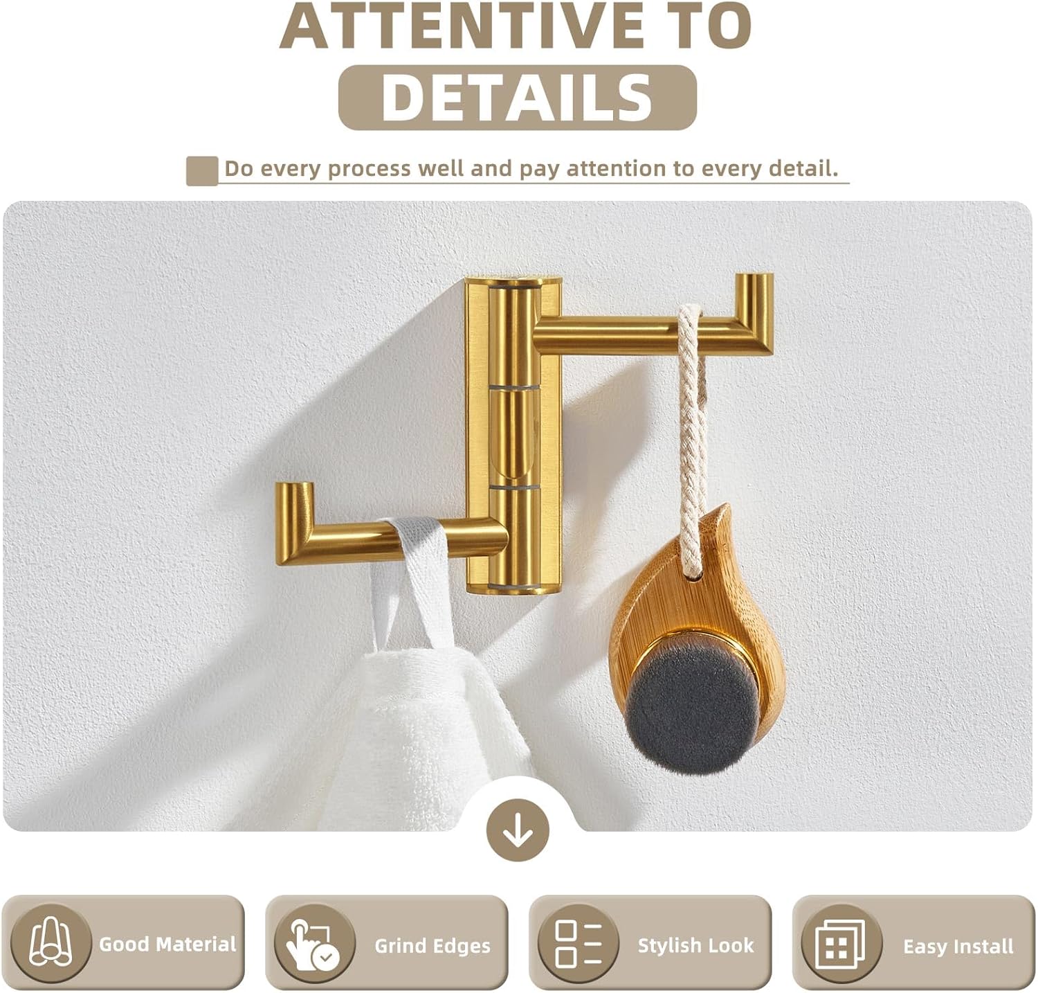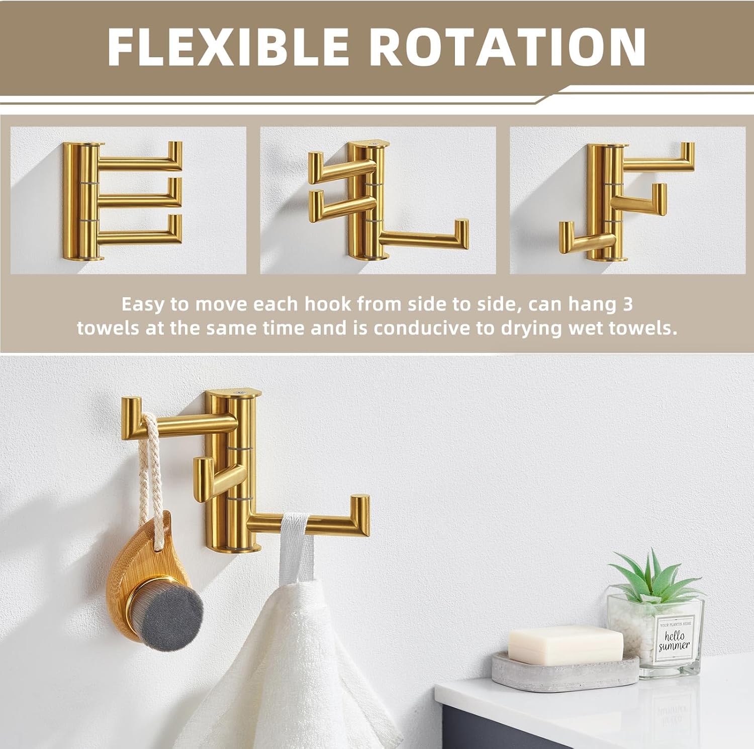 Suyar Brushed Gold Towel Hook, SUS 304 Stainless Steel Bathroom Coat Robe Holder with 3 Swivel Arms, Wall Hook for Kitchen Entry Garage
