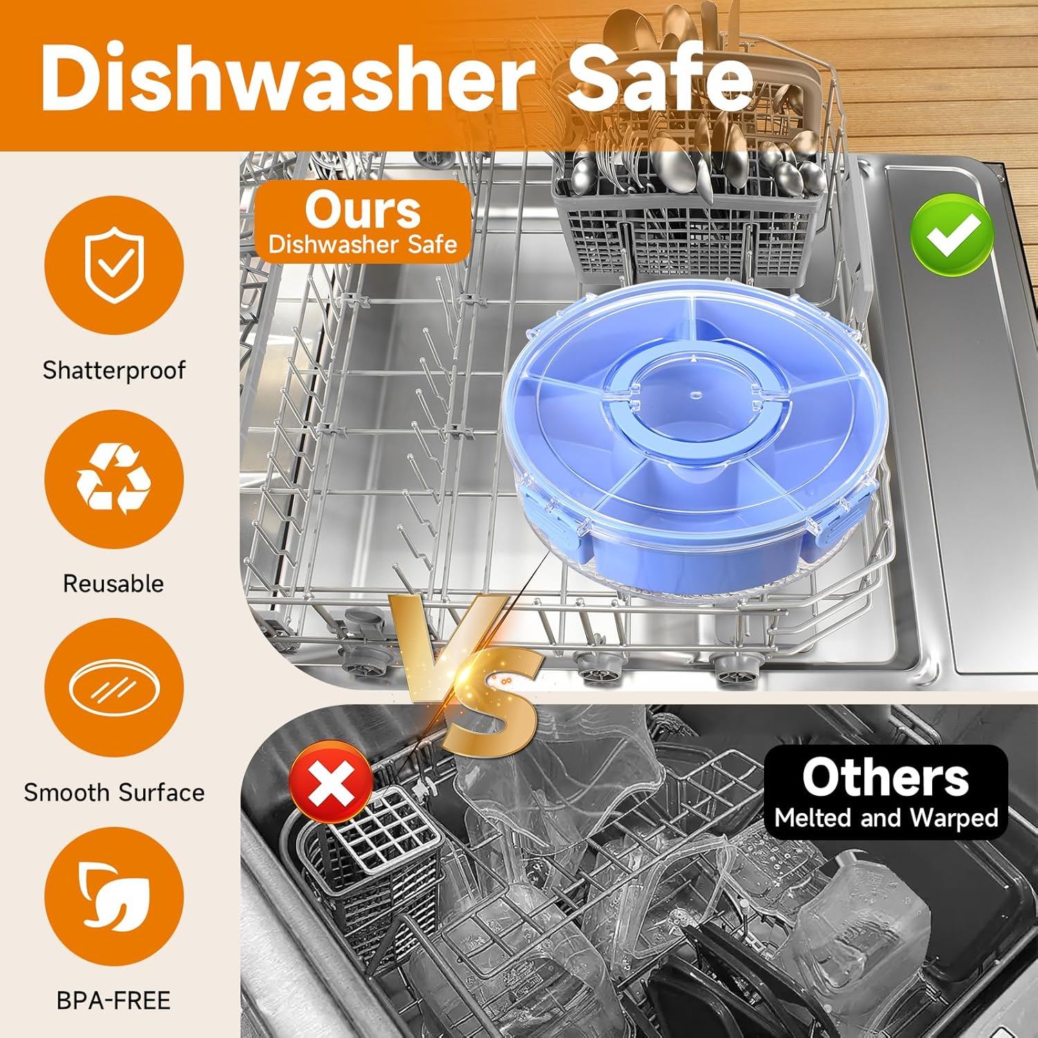 Round Divided Serving Tray with Lid, Rotating Snack Container, Dishwasher Safe Food Organizer for Fruits, Candy, Nuts, Vegetables