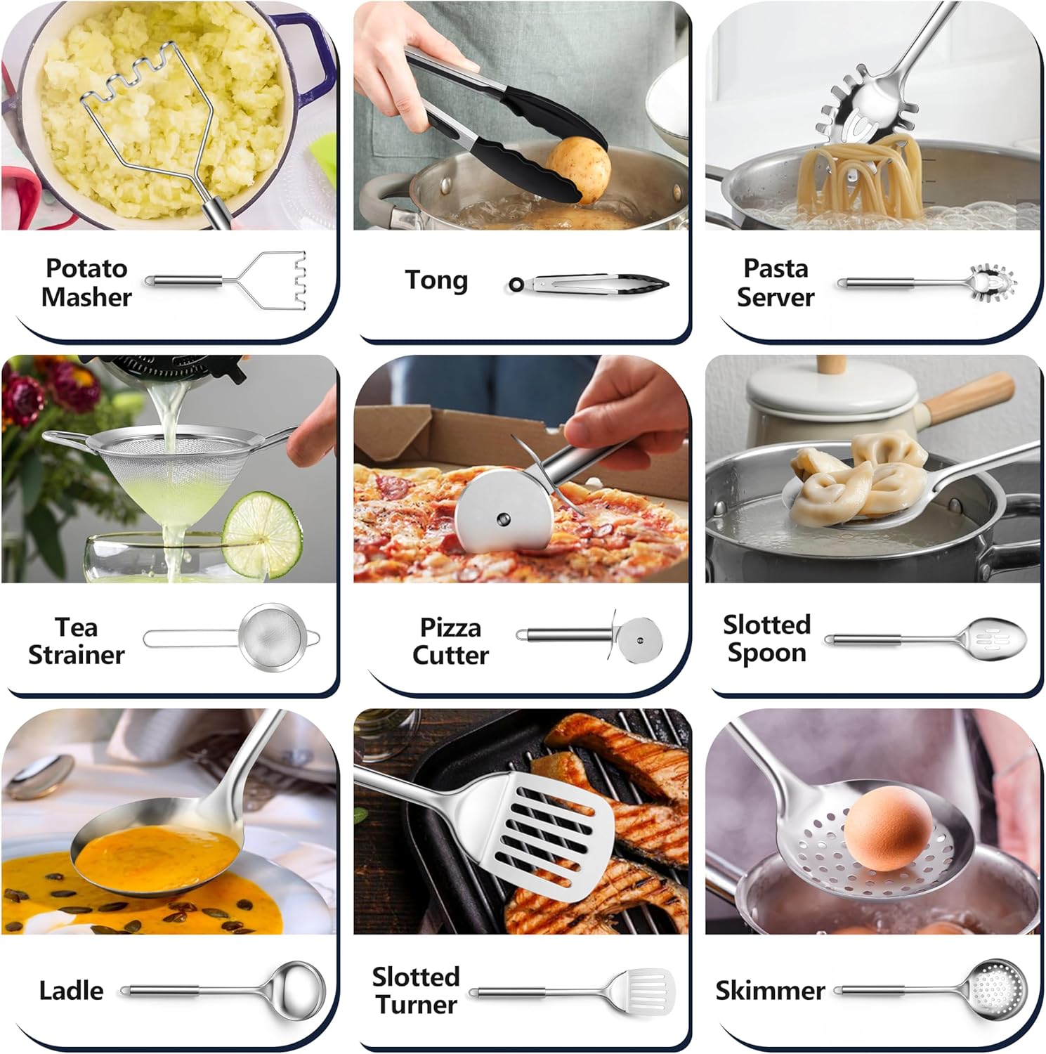- FOOD GRADE KITCHEN UTENSILS SET: Crafted from premium stainless steel, Heat-resistant and rust resistance to ensure no toxic substances release into food, No worry about burning or melting during cooking, Healthy and durable for daily cooking use