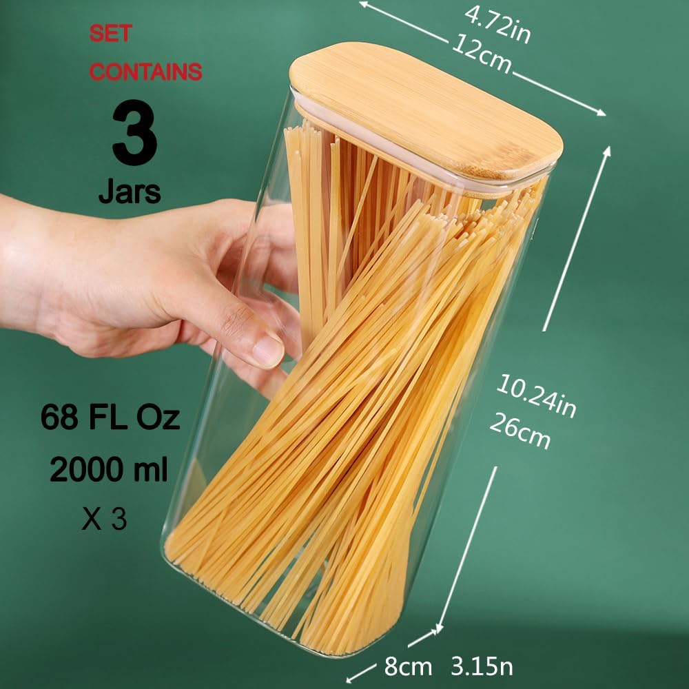 - 【3 Pack Glass Food Containers】 Package include 3 jars: 3 x 68oz /4.72*3.15*10.24inches, from grains and pasta to nuts and spices, these jars offer ample space while maximizing shelf or cabinet space. Keep your kitchen neat and tidy while adding a touch of elegance.