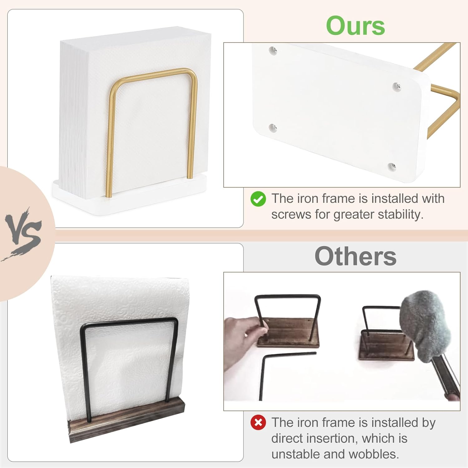 - Compact & Stable Footprint. Dimensions: 5.7" L x 3.3" W x 5.3" H—fits tight spaces without sacrificing stability. The sturdy iron rods keep napkins neatly upright and easily accessible—no more fumbling! Perfect for quick restocking during busy meals.