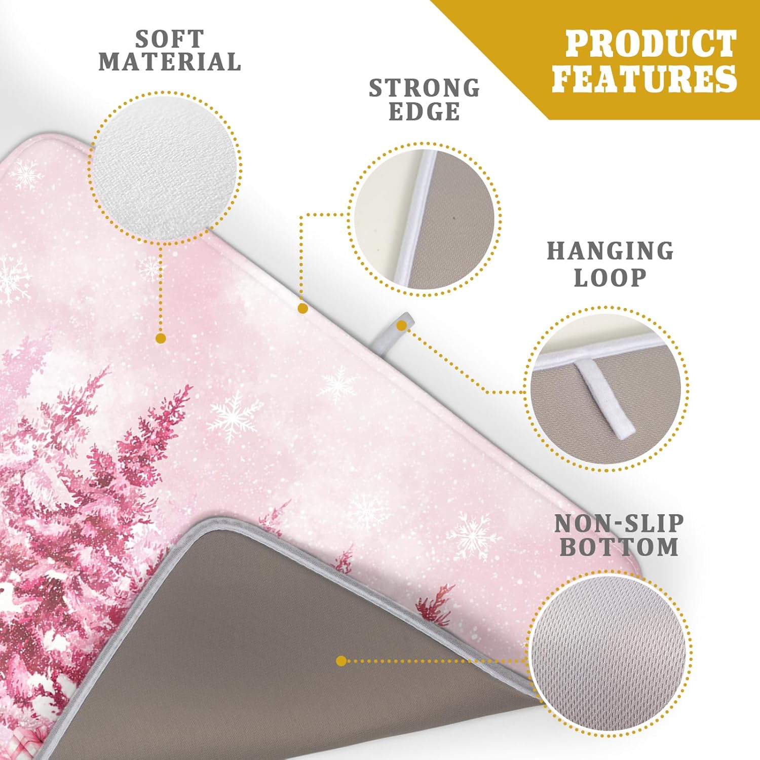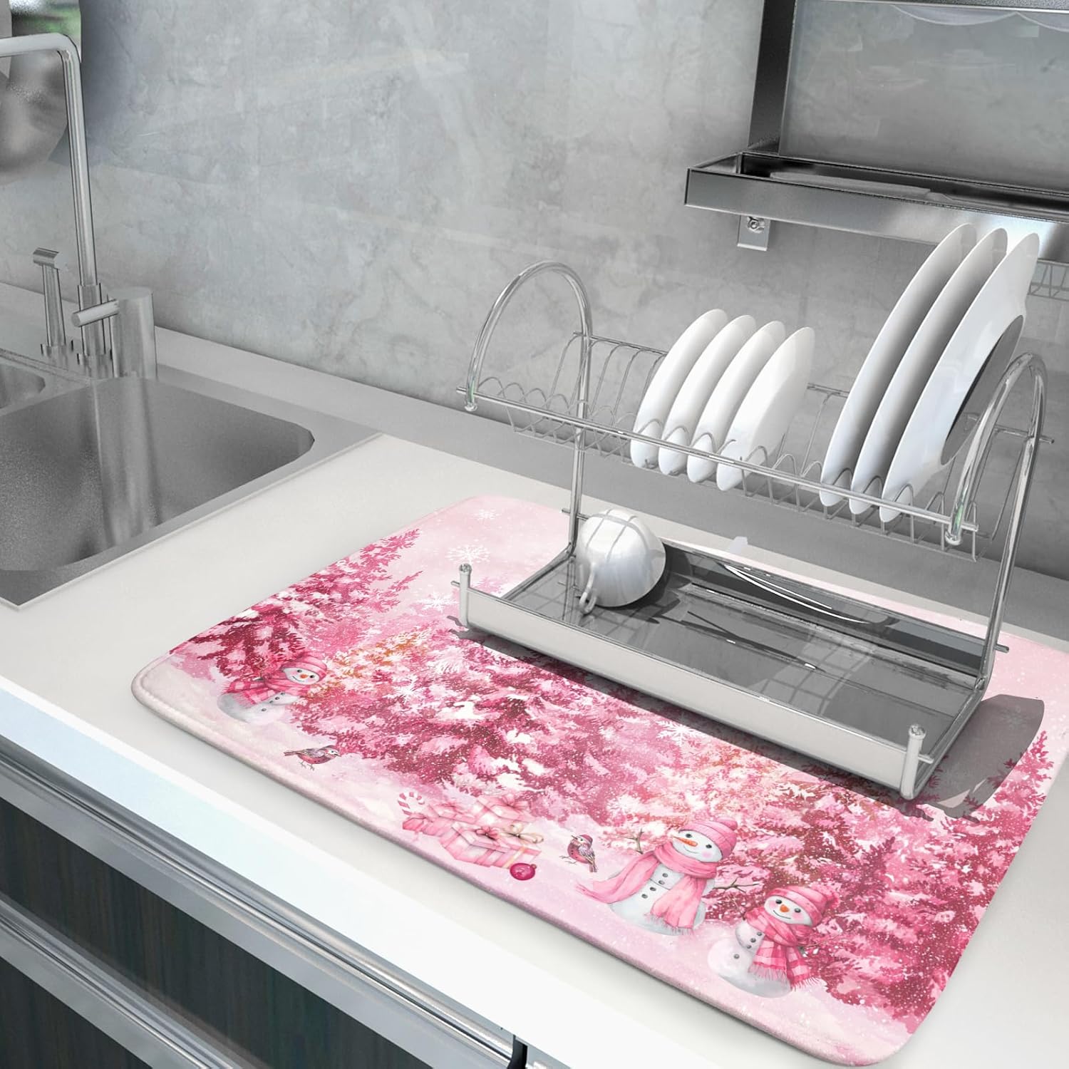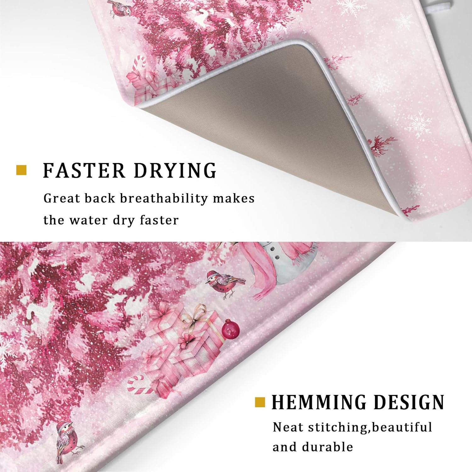 - Size: The pink winter drying mat measure 18 x 24 inch (45.7 x 60.9 cm) for you. Fit most countertop space. Different design on 2 sides, one side can suck moisture with snowman pattern, another one gray non-slip side