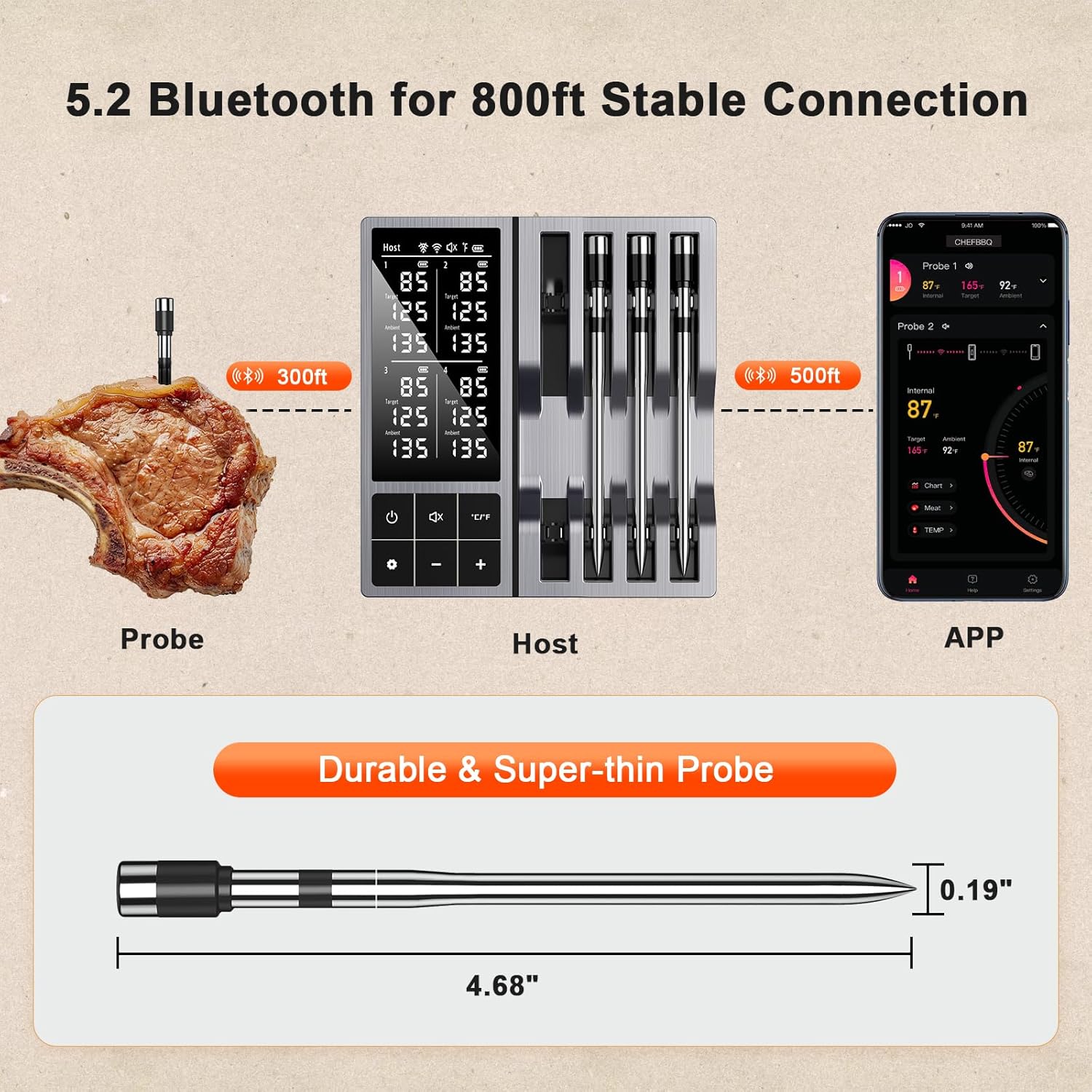 Wireless Meat Thermometer with Smart Timer & APP Alerts, 800ft Bluetooth Grill Food Thermometer, 4 X 0.19In Ultra Thin Probes, ±0.5℉ Accuracy, Big Digital Backlit Screen, for BBQ, Oven, Smoker