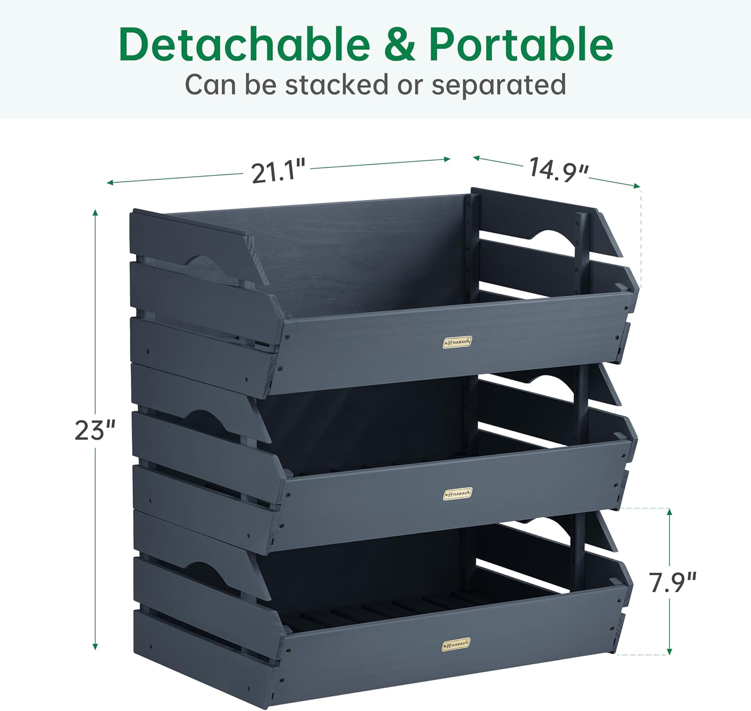 HABAU Wood Potato Onion Storage Bins - Wooden Stackable Produce Basket - Fruit Vegetable Storage for Kitchen Pantry Organization, Set 3 Pieces