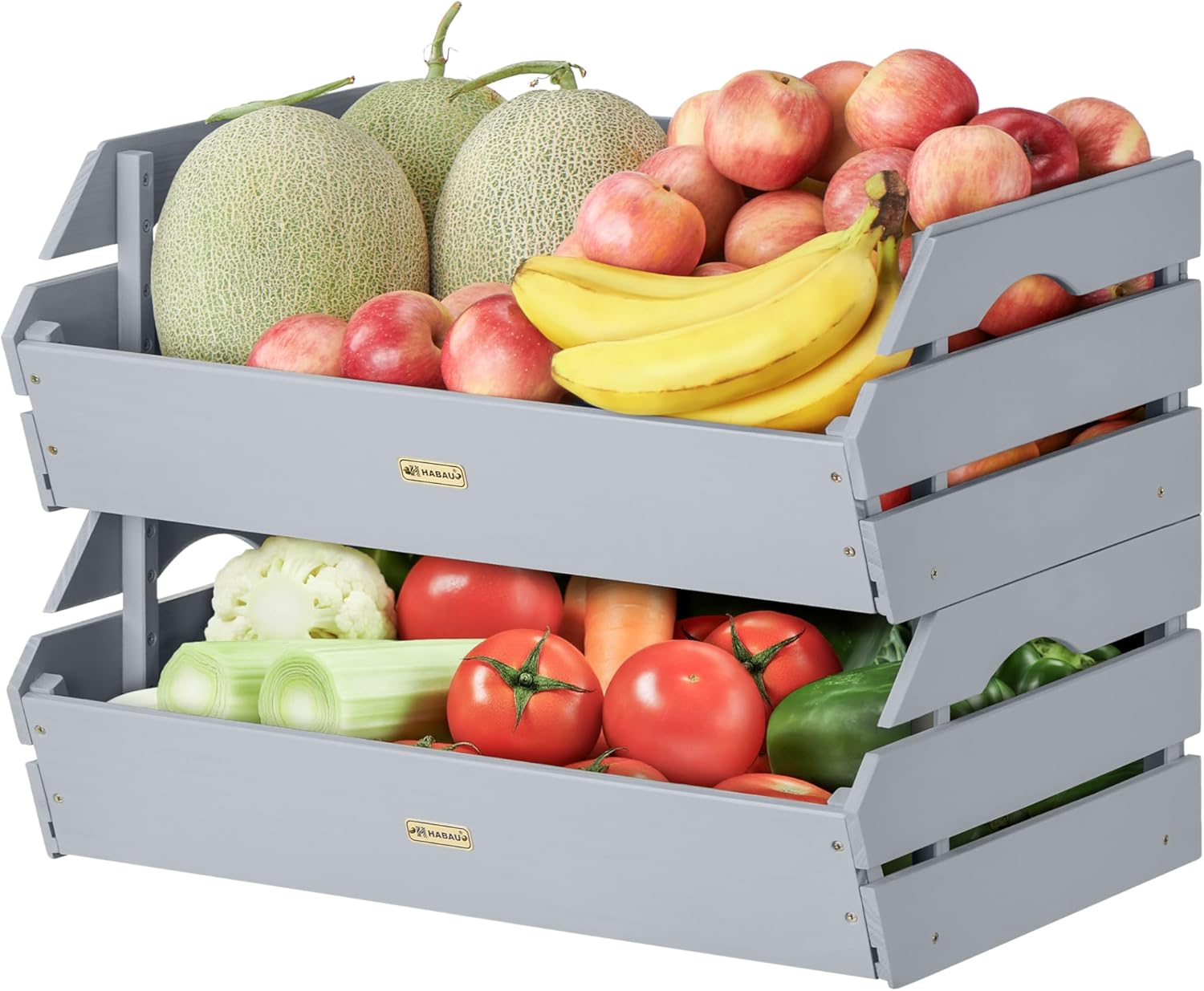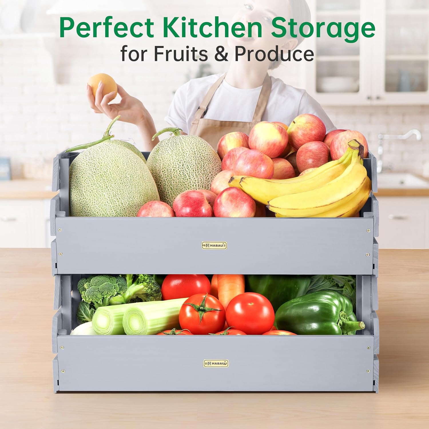 HABAU Wood Potato Onion Storage Bins - Wooden Stackable Produce Basket - Fruit Vegetable Storage for Kitchen Pantry Organization, Set 2 Pieces
