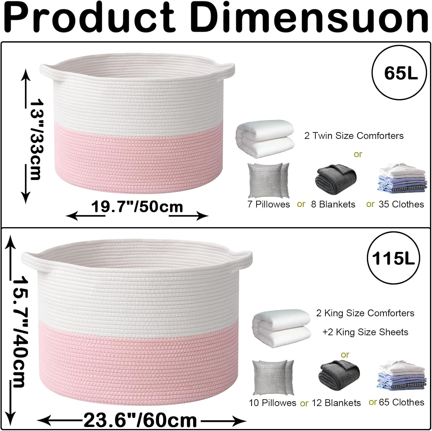 - 【Large Laundry Blanket Basket】23.6"L x 23.6"W x15.7"H Laundry basket for organizer,115L rope large cotton blanket basket with handle.Please allow 1 - 2 cm (0.4" - 0.8") for deviations due to folded transportation